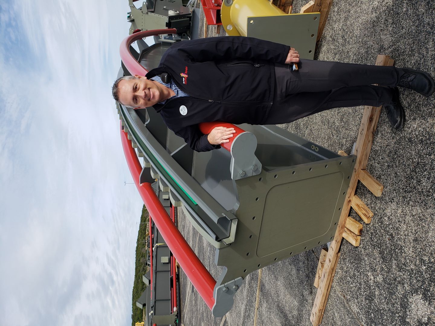 With hardly any time to grab lunch, special perks started happening fast. First was a tour of the construction area of Dr. Diabolical’s Cliffhanger. The green rooms and backstage areas of the former Sundance Theater were retained to be part of the queue line experience (details of which are being kept under wraps until the ride’s debut). Soon, attendees gathered for a “hidden secrets” tour. Once everyone assembled in the back areas of the park, a guest appearance (performance?) from Dr. Diabolical herself greeted ACEers. She welcomed followers to examine her machine planned to debut in the summer of 2022. In other words, enthusiasts got to see track pieces and ride parts. Such opportunities always make for great photos. The duplicitous doctor even posed with several soon-to-be victims.