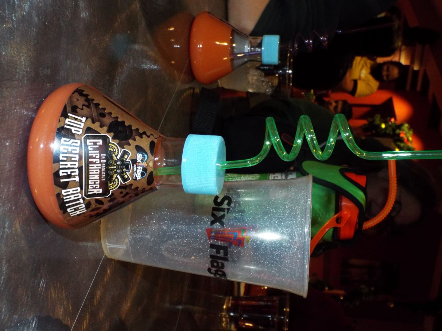 Dinner was holiday fare (ham, turkey and traditional sides) back inside La Terraza once again. If pecan pie didn’t satisfy one’s sweet tooth, a second character interaction took place. Dread, one of Dr. Diabolical’s assistants, gave attendees the very first batch of Dr. Diabolical’s Youth Elixir. It was sweet, tangy and yummy. The bottle made for yet another collectible for the day, adding to the event button, pin and coaster layout card.