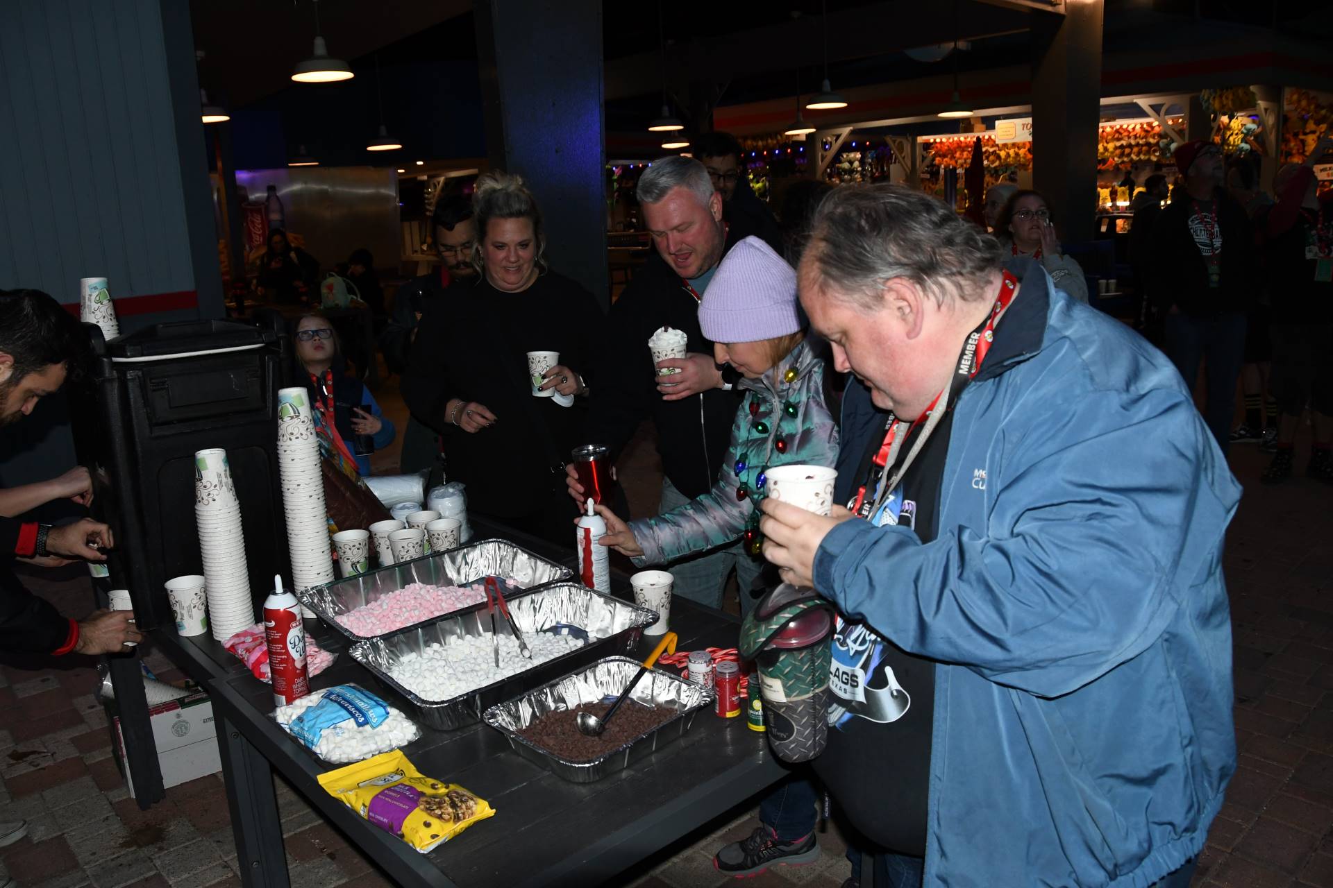 One of the evening activities scheduled was an ACE-exclusive train ride; however, the train had other plans and that unfortunately didn’t pan out. Once closing hour arrived, attendees gathered in front of Superman Krypton Coaster for night ERT, coupled with hot chocolate and a toppings bar. Hot drinks! That was the ticket to pair with chilly rides. A members event was going on elsewhere in the park that ACEers were welcome to join, but most everyone stayed with the camaraderie of the Feliz Fiesta event.