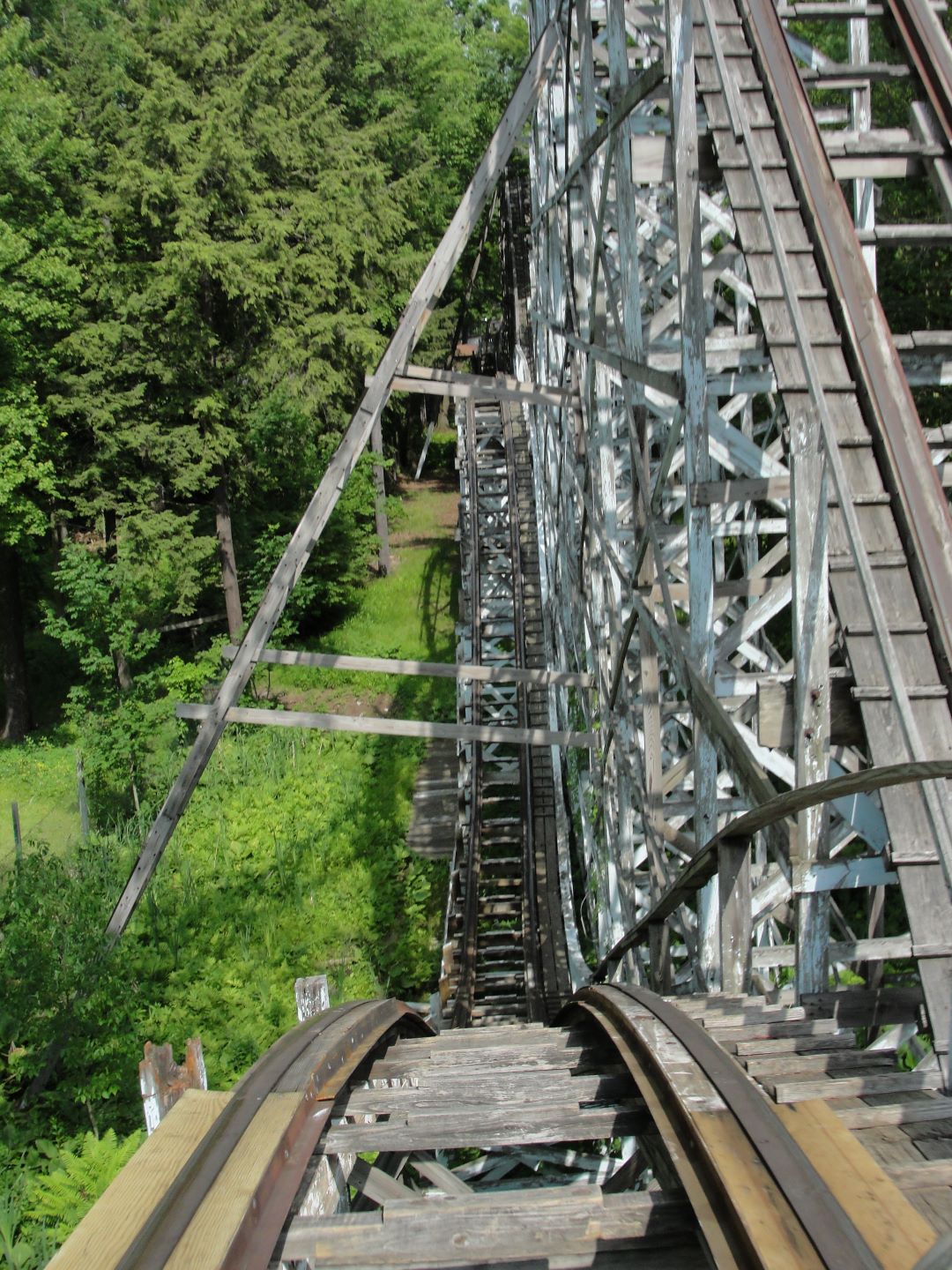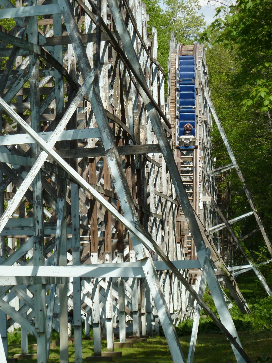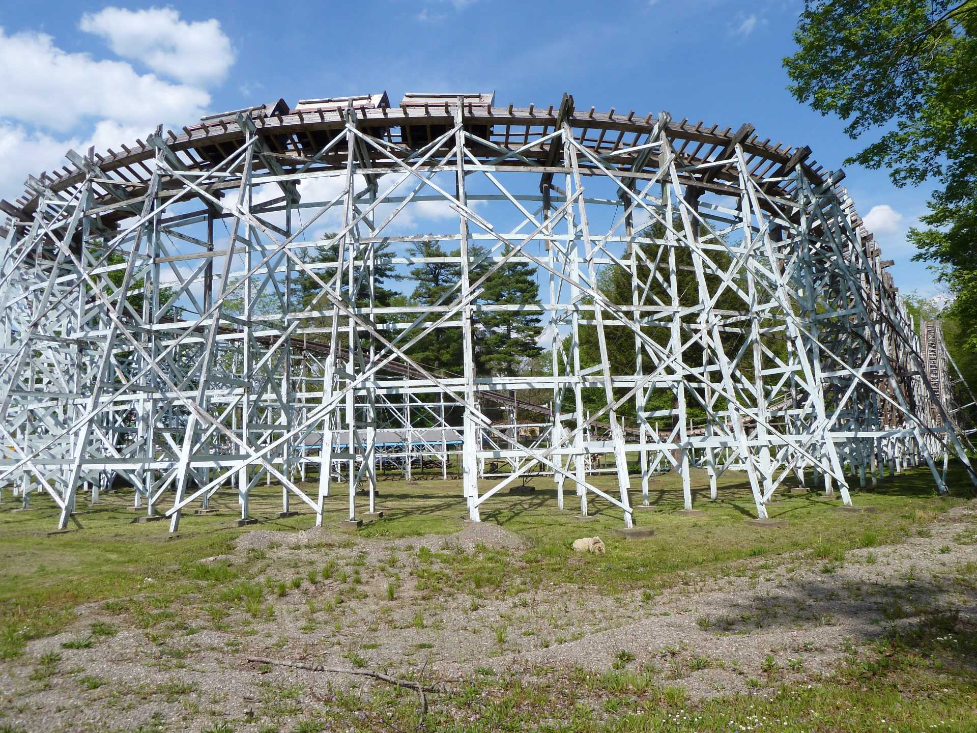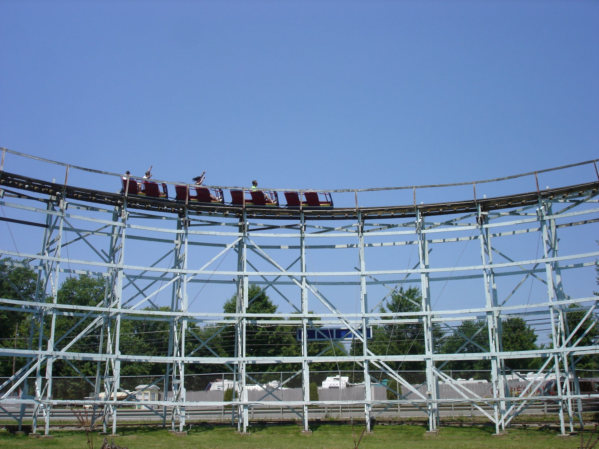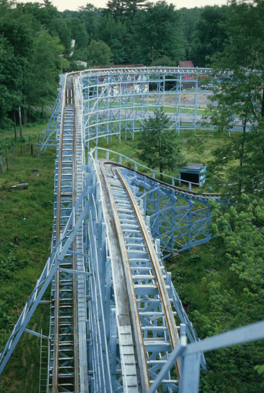 Blue Streak opened at the park in 1938 and was one of two remaining wood coasters designed by Edward Vettel Sr. (Cyclone at Lakeside Park in Denver is now the only one.) Originally, it ran two Vettel trains, but in the mid-1960s the Vettel trains were replaced by two National Amusement Device (NAD) Century Flyer trains. One of the NAD trains was destroyed in the Beach Club fire of 2013, and although one of the Vettel trains was restored, it didn’t run in later years because of insurance restrictions. At least part of the restored Vettel train will be donated to a local history museum. The fate of the remaining NAD train is unknown.