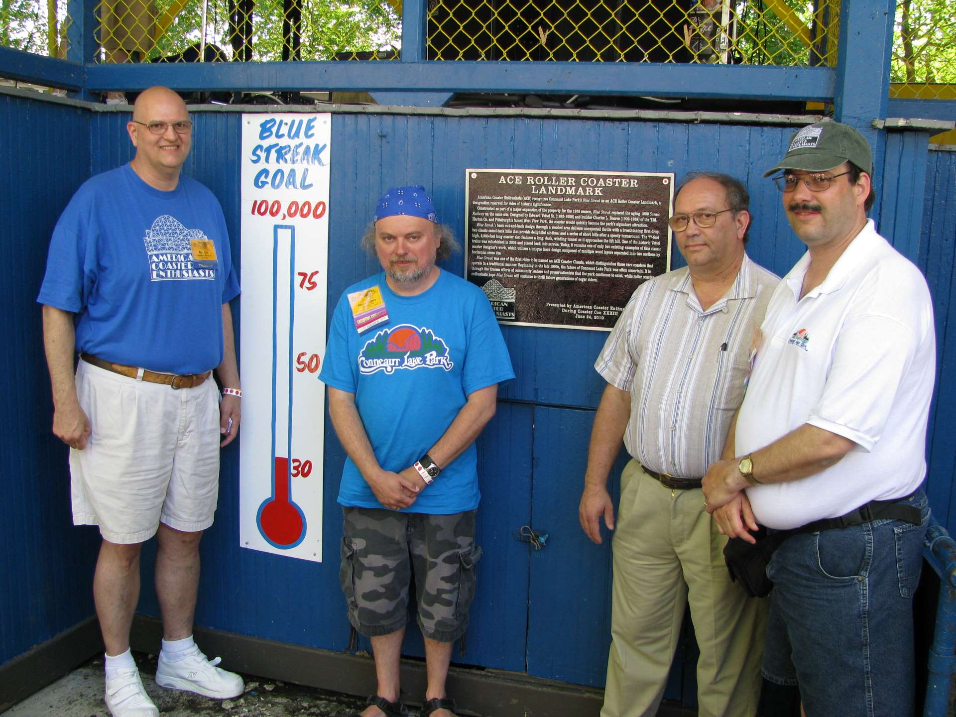 Blue Streak was designated an ACE Roller Coaster Landmark in 2010. Seen here are ACE President Mark Cole, Preservation Director Howard Gillooly, Jack Moyers (former chairman of Conneaut Lake Park’s board of trustees) and historian Dave Hahner.