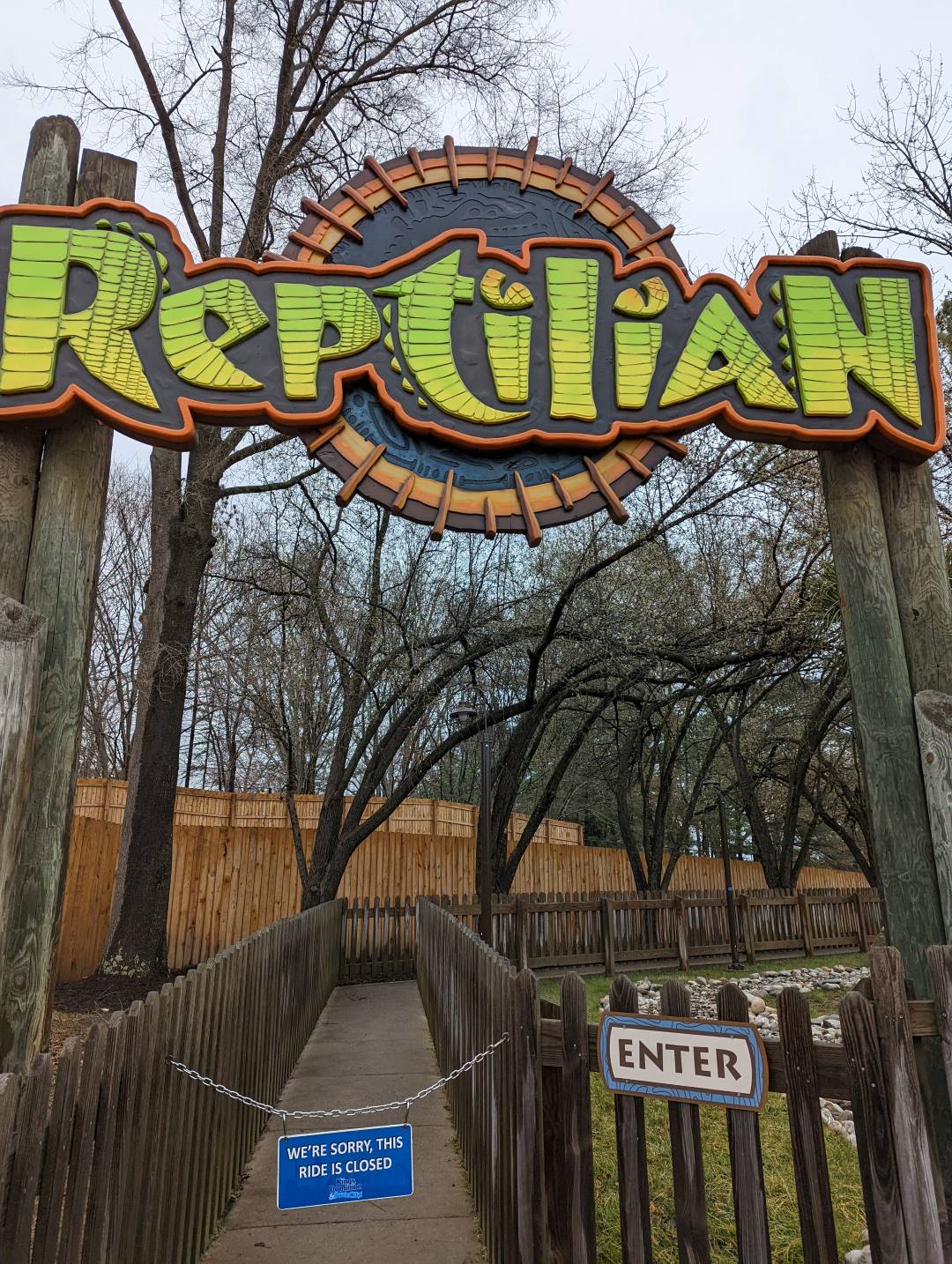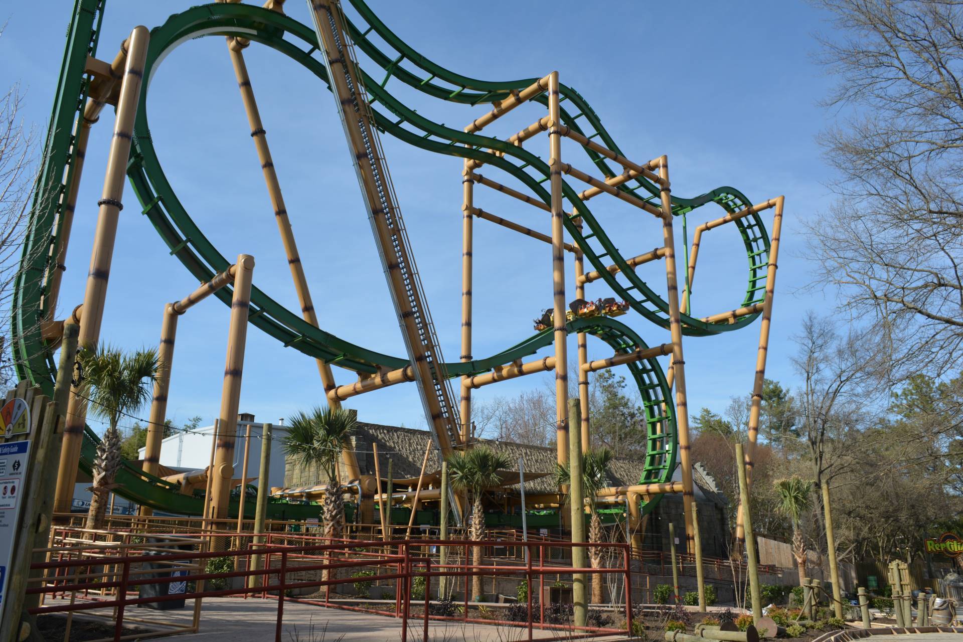 After journeying through the Candy Apple Grove or Planet Snoopy portions of the Doswell, Virginia, park, guests approach Jungle X-pedition. Numerous restaurants such as Jungle Market Eatery and Outpost Café, restrooms and retail shops line the pathway to Tumbili and two other rides rethemed to match the jungle aesthetic. Kings Dominion’s classic bobsled-style coaster, Avalanche, is now known as Reptilian. The coaster sports a vibrant and scaly entrance logo, while freshly coated cars showcase menacing teeth. Originally white, the track has been repainted to an orange-brown color and sits adjacent to the now-defunct mountain that housed the various rides inside it over the three-plus decades it stood.