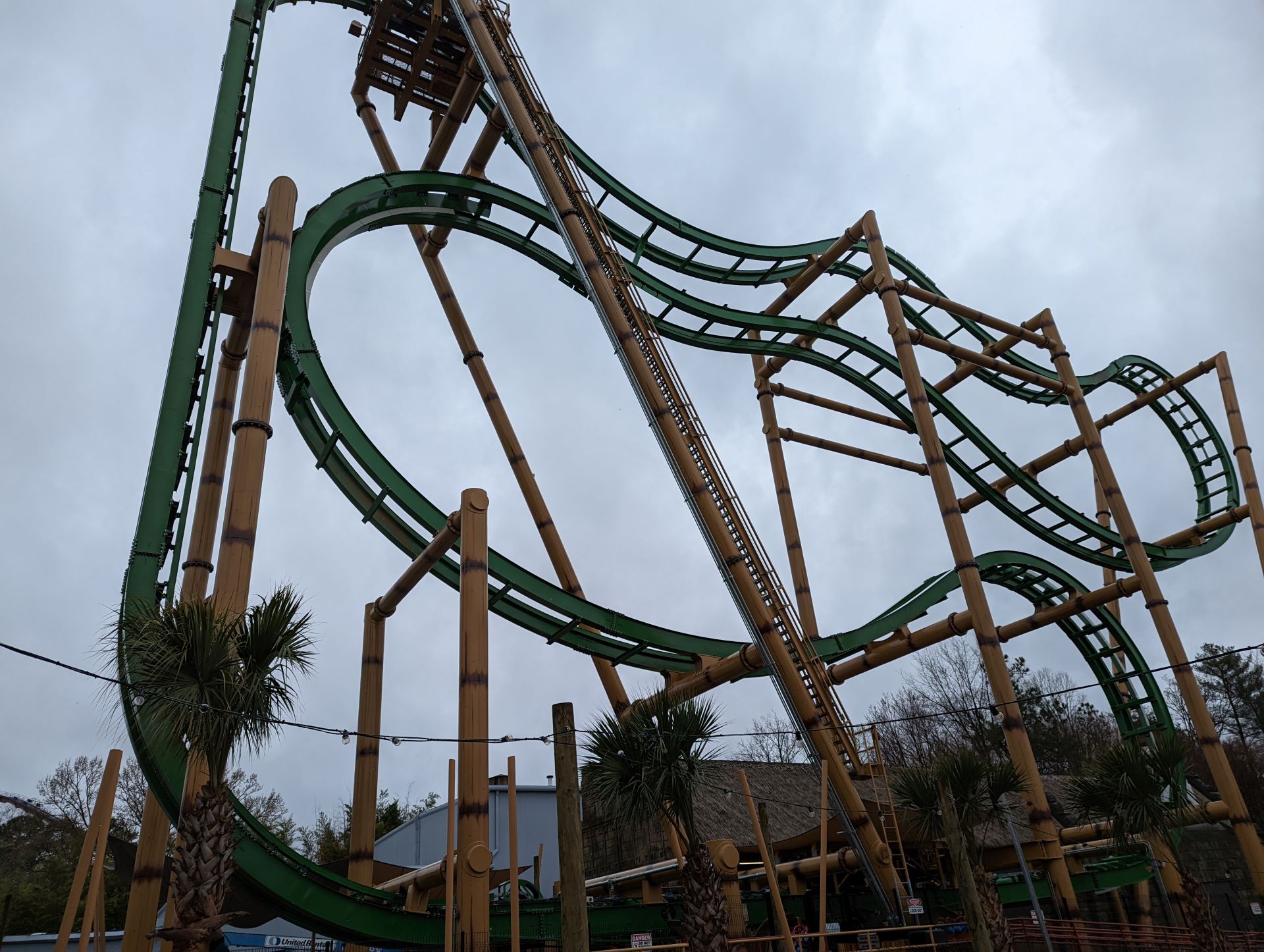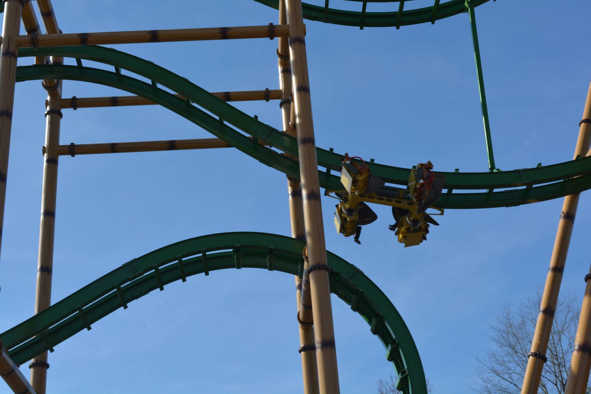 Tumbili (Swahili for “monkey”) is Kings Dominion’s newest coaster and an anchor point in the renamed and upgraded area now called Jungle X-pedition. As the first 4D Free Spin coaster in the region, it replaces the long-standing, inverted flat ride named Crypt that closed in 2019 after 14 seasons. Tumbili renews the excitement by spinning riders upside down while traveling at 34 mph down a stunning green track, seemingly held up by bamboo-like supports.