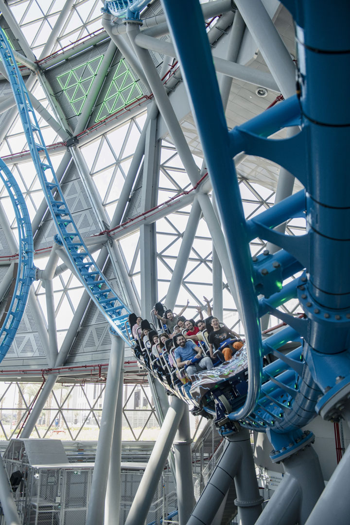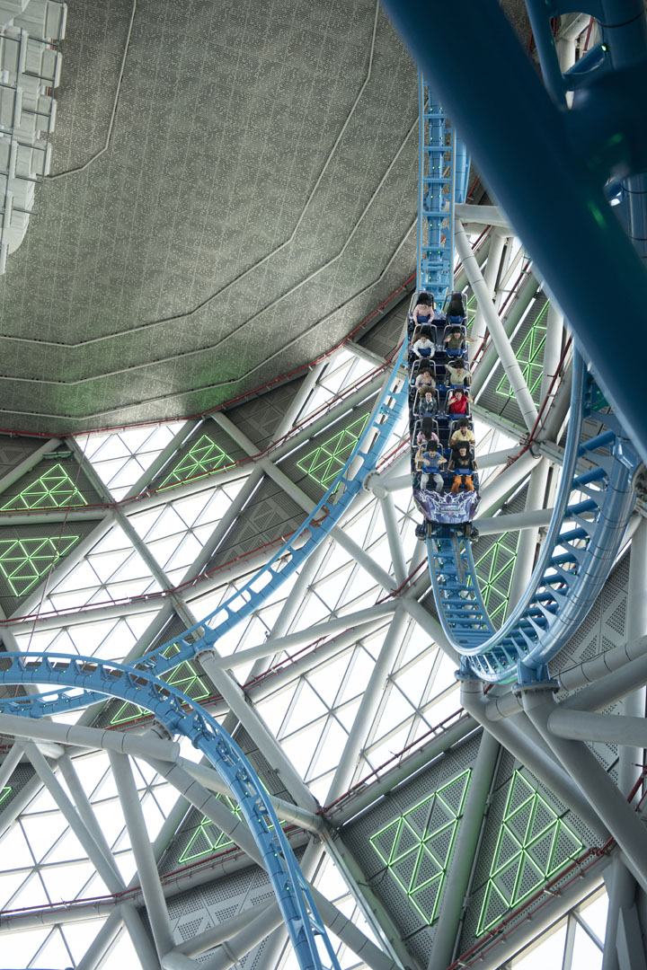 The Storm Coaster is a stand-alone attraction within the mall. It serves as a spectator piece to both tourists and shoppers. Constructed inside a 50-meter (approximately 164 feet) dome, the coaster is physically built into the structure of the building itself. But that isn’t the only rarity to the ride.