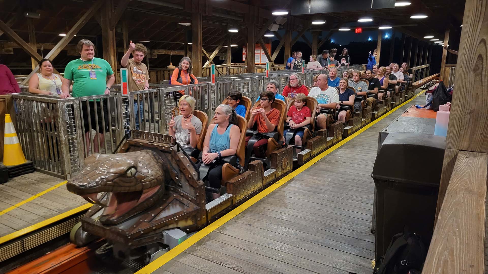 A dinner of barbeque with all the trimmings was served, and announcements were made by the ACE South Central rep team and Park President Jeffrey Seibert. After dinner, attendees were taken for a short walk to get a surprise, up-close and exclusive first look at Dr. Diabolical’s train for the new dive coaster. In true Fiesta Texas fashion, the reveal was done with theatrical flair with Dr. Diabolical herself, fog and dramatic lighting. Attendees found it great fun.
