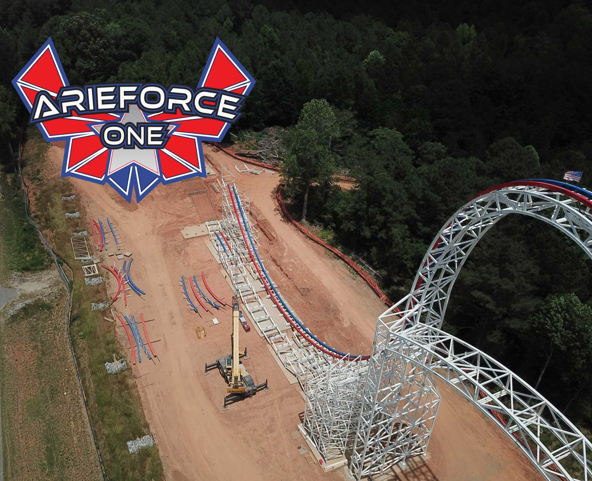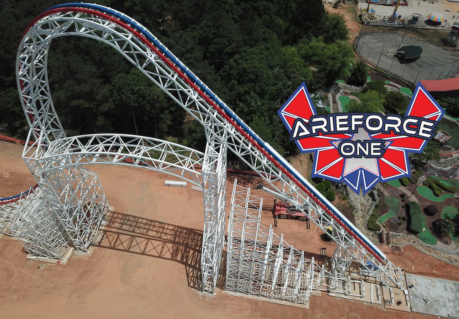 Another RMC creation is taking shape as construction sprawls on ArieForce One at Fun Spot America Atlanta (Fayetteville, Georgia). The red, white and blue structure stands 155 feet tall. Once open, the ride will speed passengers through four inversions and multiple airtime moments at 64 mph.