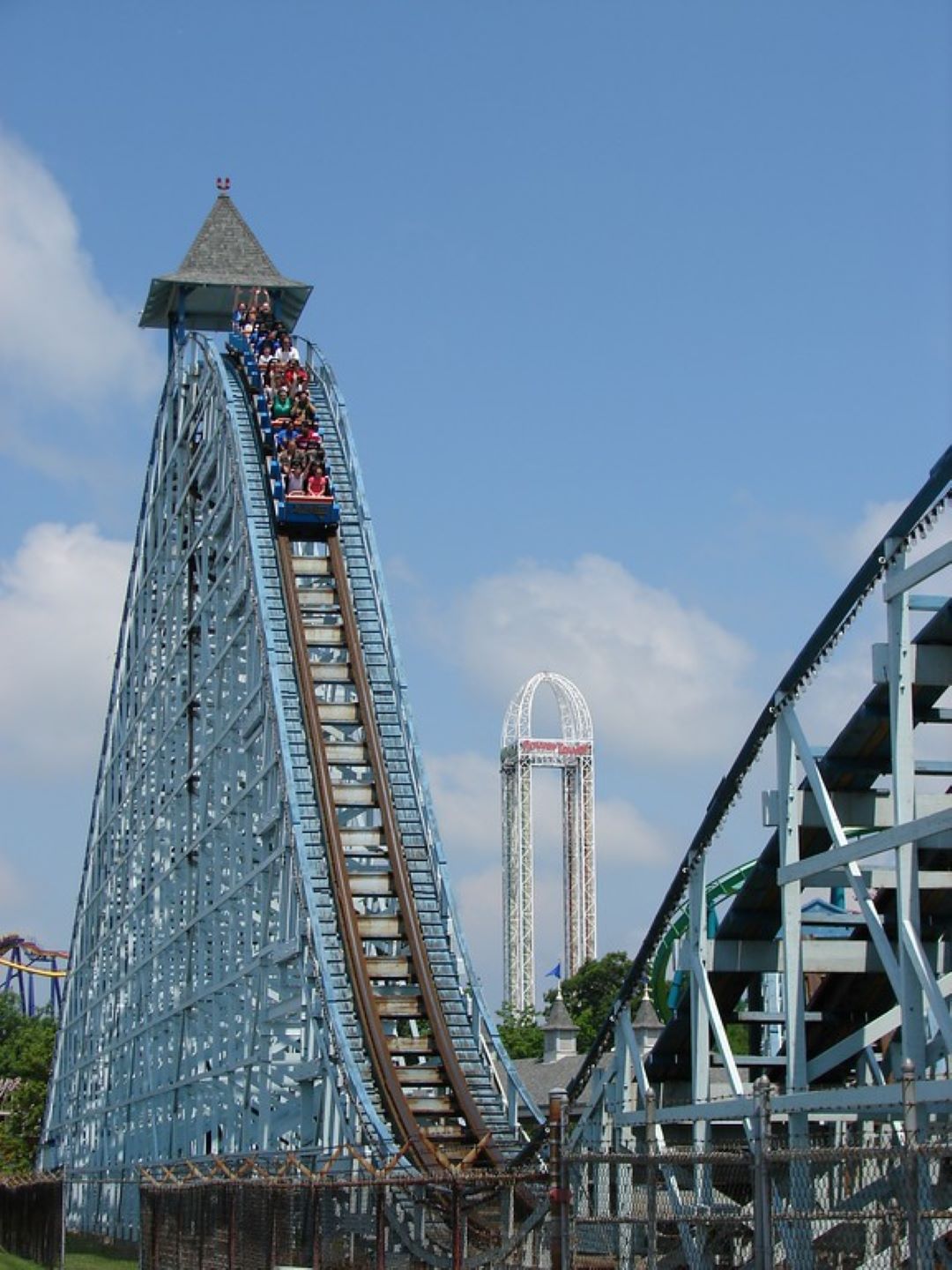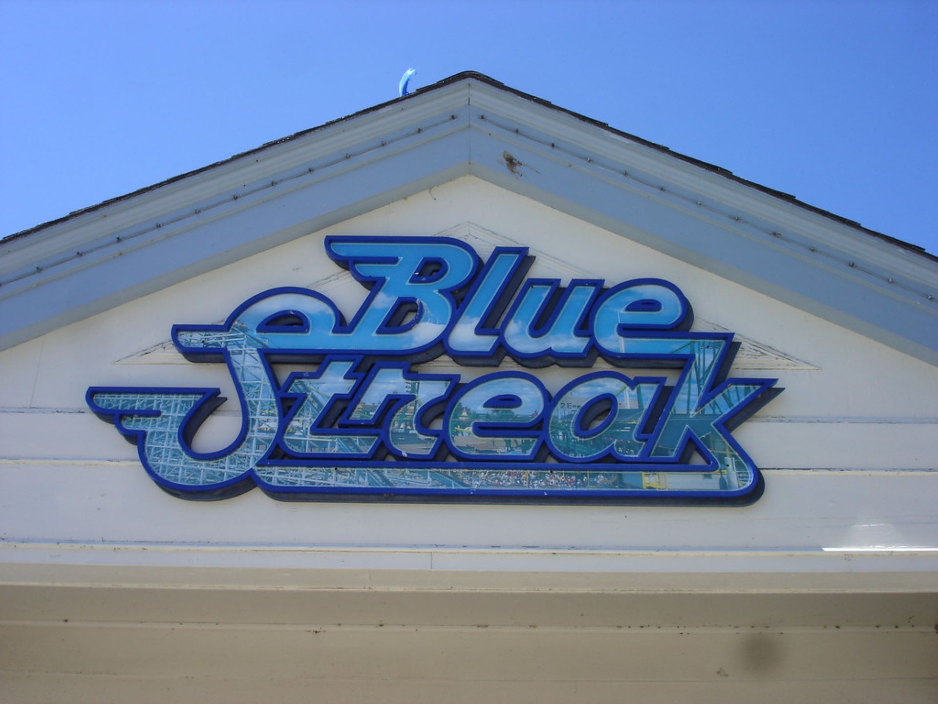Named after the Sandusky High School athletic team (the Blue Streaks), Blue Streak sends riders over several hills after dropping off the lift at 40 mph before reaching a turnaround and heading back toward the station over even more bunny hills. The ride’s track was originally unpainted when Blue Streak first opened, until it received a sky-blue paint job four years later that remains to this day.