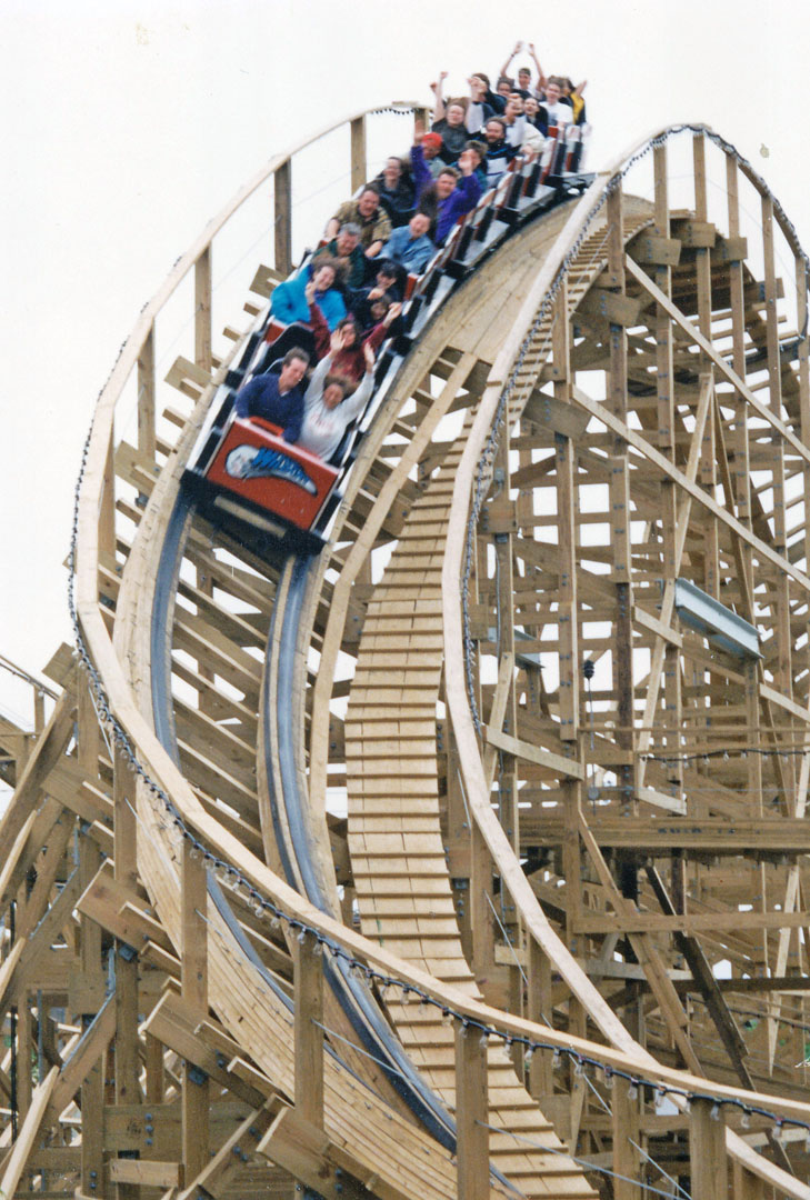The Dinn Corporation closed in 1992, but Charlie Dinn’s daughter, Denise Dinn-Larrick, established Custom Coasters, Inc. (CCI) and kept the momentum of wooden coaster building going. CCI built dozens of coasters, but runaway success caught up with the company. CCI eventually closed its doors in 2002, actually leaving its final project unfinished. Following the company’s closure, several of those still on staff went on to form The Gravity Group.