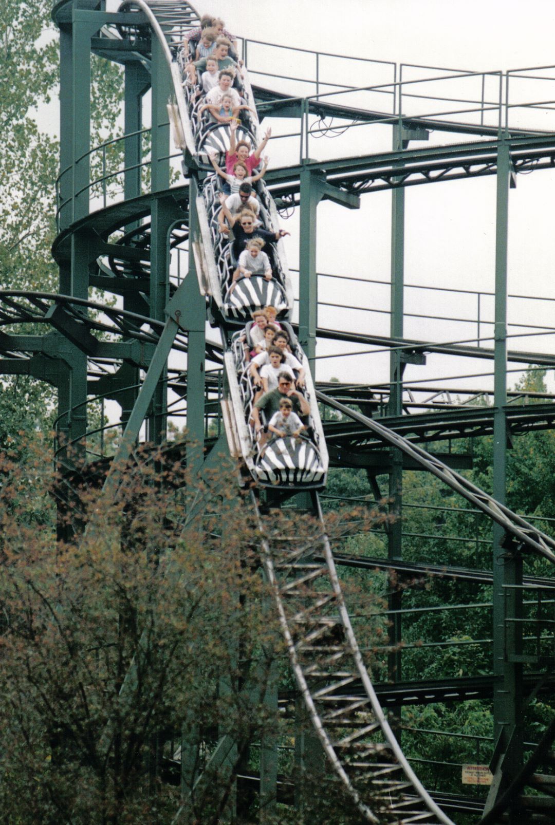 A former coaster by that name at the park was a Schwarzkopf Speed Racer that operated from 1973 to 1997. It was one of four such rides that were built in the 1970s. As theme parks continued to flourish in this decade, new parks needed major attractions. Schwarzkopf was a solid provider of major rides for parks in development. Of those original four, only one remains today, the ACE Roller Coaster Landmark Whizzer at Six Flags Great America (Gurnee, Illinois). When Zambezi Zinger was dismantled, it was purchased by Parque Del Café (Montenegro, Colombia), where it has operated since 1999. Considering the Schwarzkopf coaster was built specifically for Worlds of Fun’s terrain, that was an interesting feat.