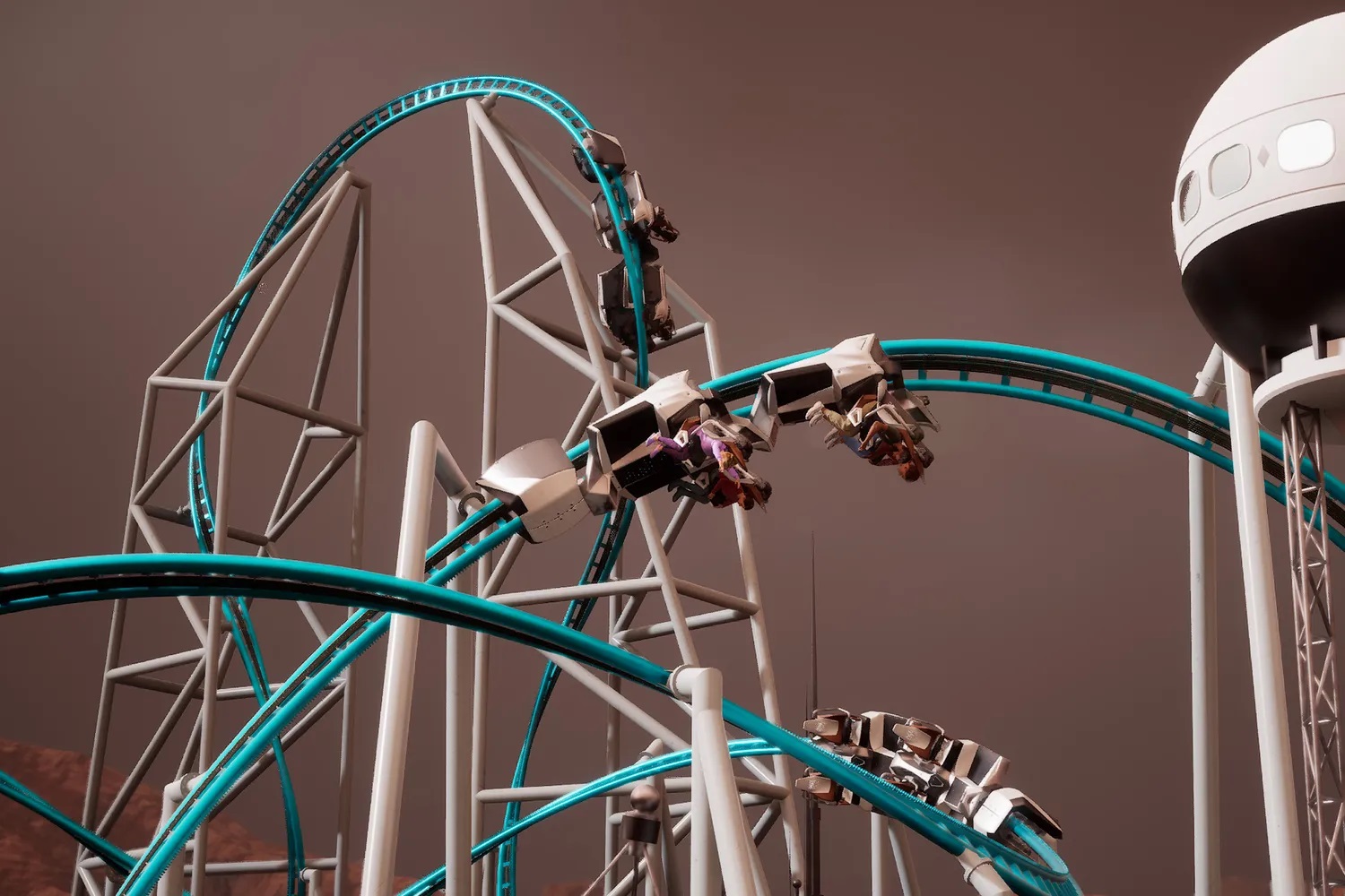 The Omega Loop is designed to be the first element on the ride after launching from the station. While the most dramatic-looking moment on the attraction, it doesn’t technically go upside down. However, the concept layout does have two inversions — a zero-G roll and a corkscrew. It’s all wrapped up in a tangle of twists, turns and dives.