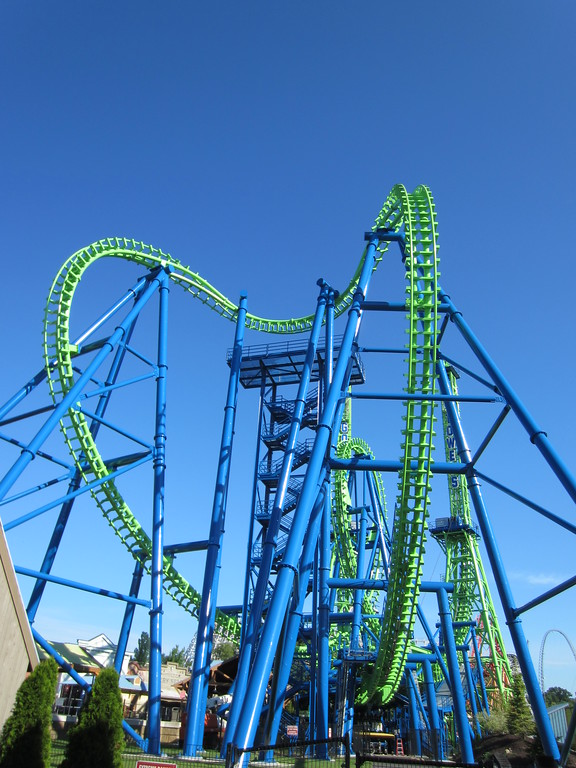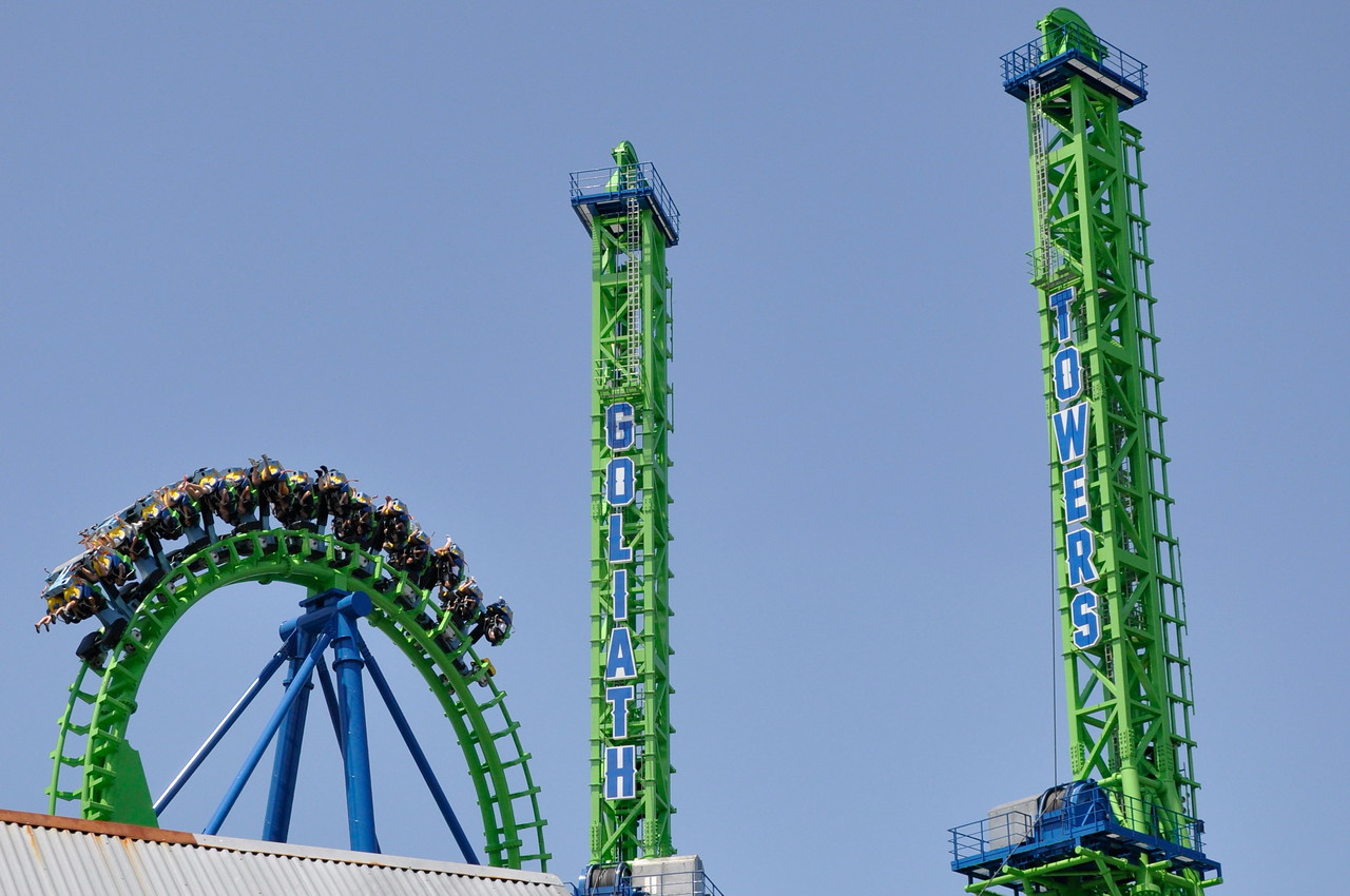 Goliath was one of six Vekoma giant inverted boomerang models built. Goliath’s tallest point was 177 feet, and it reached speeds of 61.5 mph as it made its way through the layout both forward and backward. When it was relocated to Six Flags New England, it was strangely placed directly across from Flashback, a standard Vekoma boomerang model. The coaster was plagued with maintenance issues after its relocation and was outfitted with new trains manufactured by Premier Rides shortly after opening as Goliath. Many riders complained of a rougher, less comfortable ride after experiencing the new trains. Goliath remained standing but not operating for two seasons until deconstruction began in October 2021.