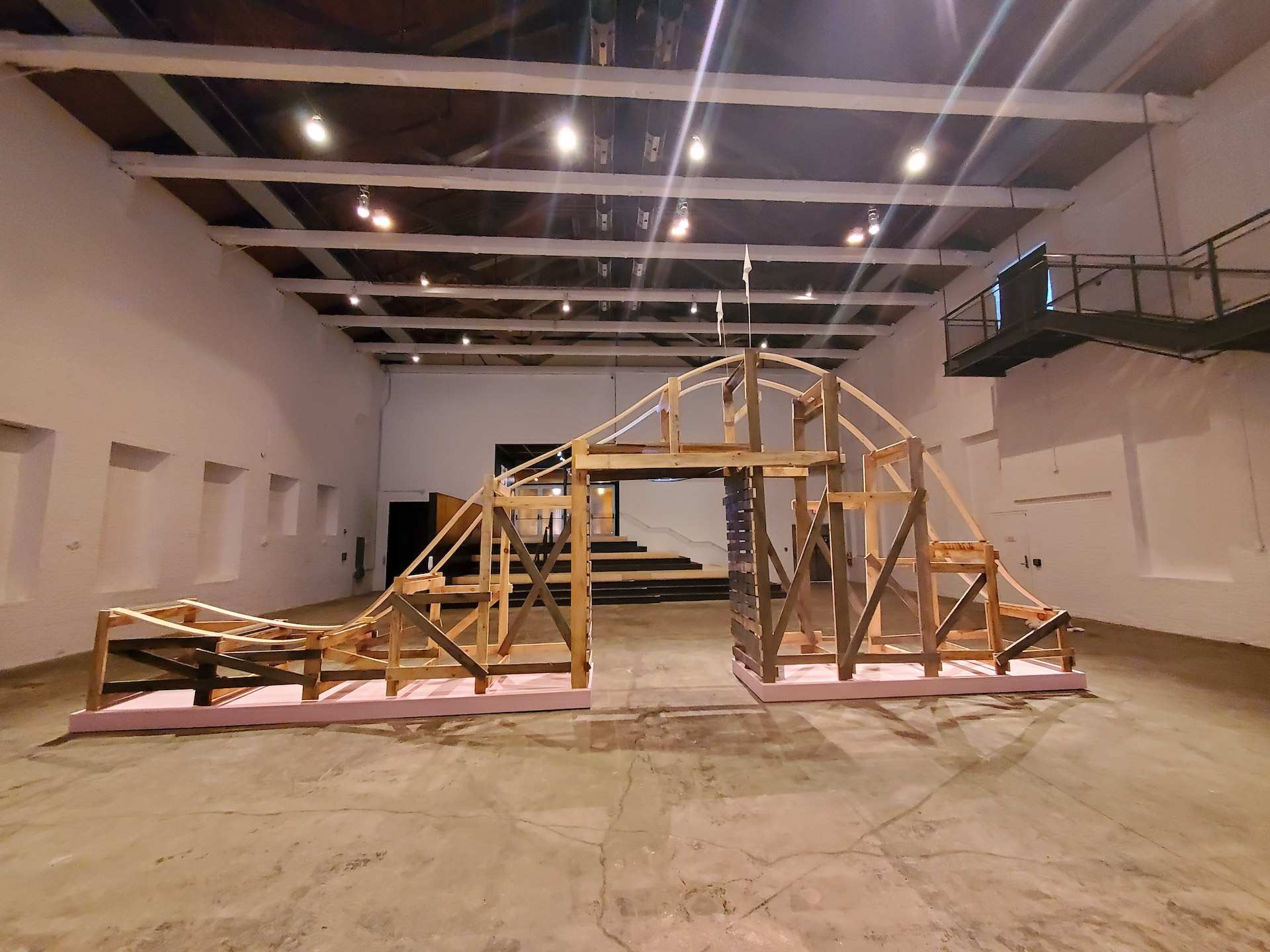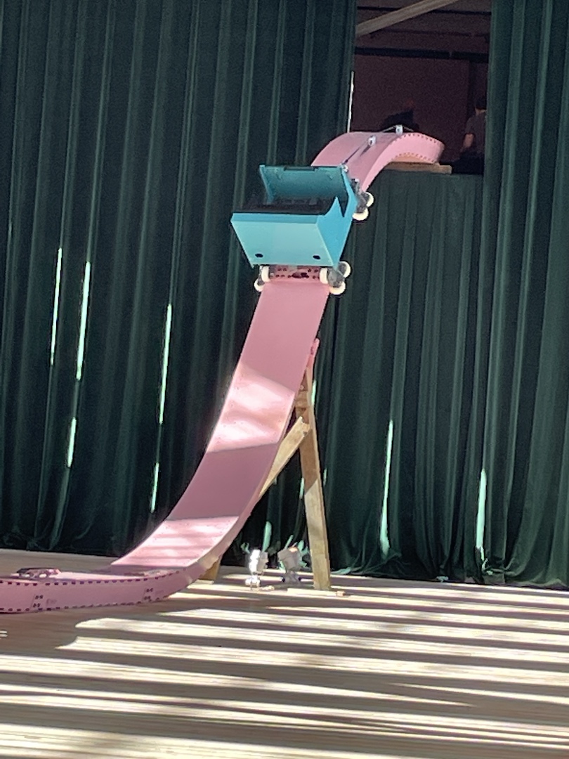 As described on the MoCA website, “In Brake Run Helix, Hill inverts the experience of riding a roller coaster, transforming it from a shared ritual of joy and terror to an individual performance: only one person may ride the roller coaster at a time. Brava!’s single cart emerges from behind a two-story velvet stage curtain, moves across the coaster’s pink tracks, and ultimately comes to rest on the wooden stage, while onlookers observe from below. Visitors can see the roller coaster activated by riders throughout the day.”