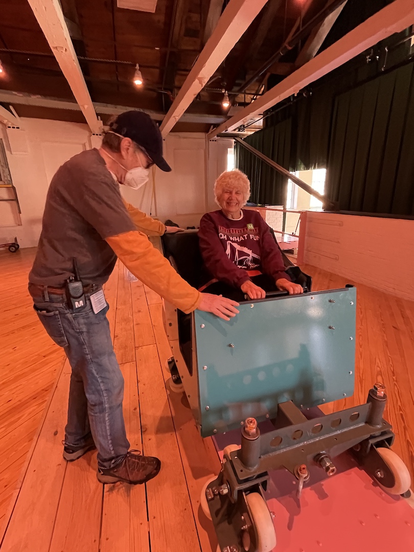Once securely buckled in, a member of the museum staff removes the stakes and pushes the car along the level track to the opening where the full view of the coaster can be seen. The rider is then pushed to the precipice, er, to the first drop.