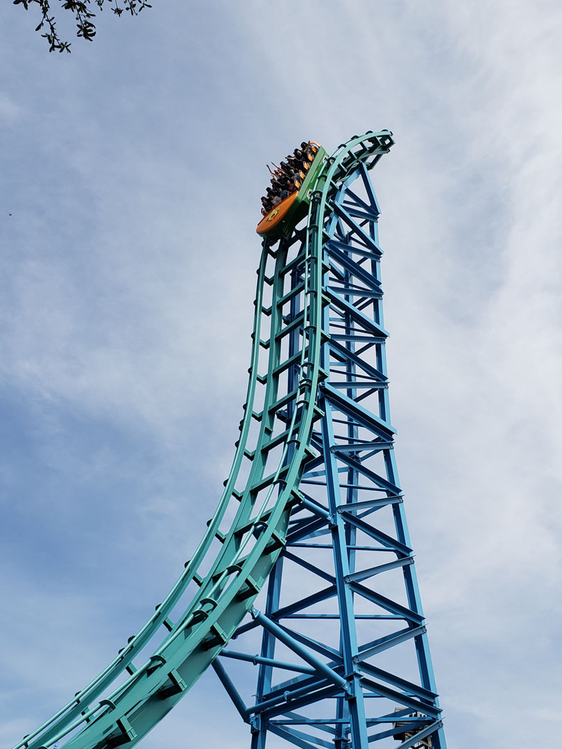 The ride is relatively simple. While one boat is out on the rails, another boat is loading. A turntable rotates to put the second boat in place. The vehicle quickly takes off in reverse with the first of three launches. Rolling up the back tower only part of the way, the boat rolls forward and engages with the second launch, increasing the speed of the ride. After rising up the other vertical track, riders feel true weightlessness and then freefall to engage the final pass on the linear-synchronous-motor (LSM) launch system. The nifty thing here is the moment of airtime experienced (backward) while zipping over the speed bump. With a top speed of 63 mph, passengers climb almost to the top of a 150-foot-tall backward spike. The tower has just a slight curve at the top, adding a touch of tilt, making the final plunge even that much more delicious. The straight-down view of the blue pool below is breathtaking.