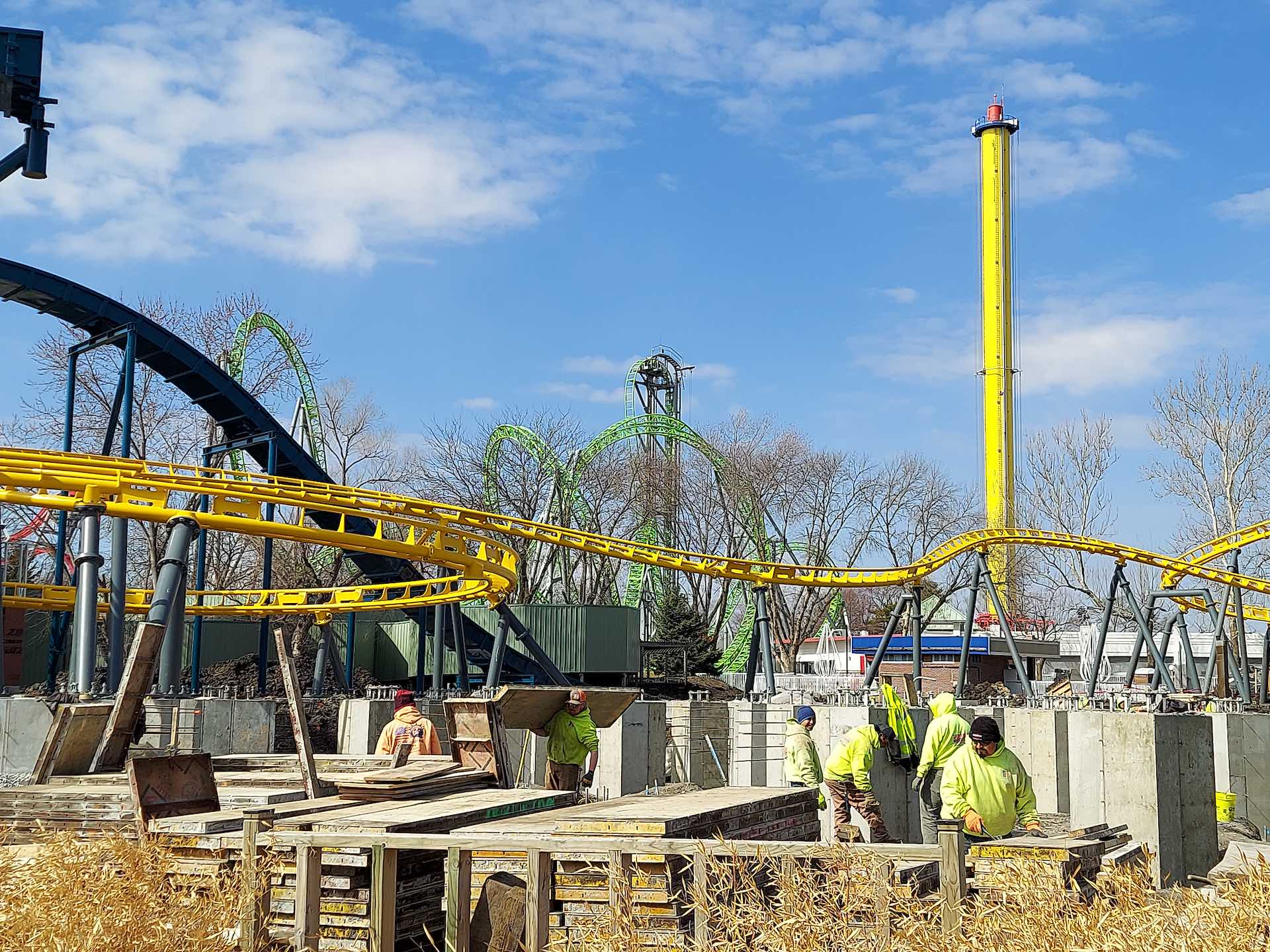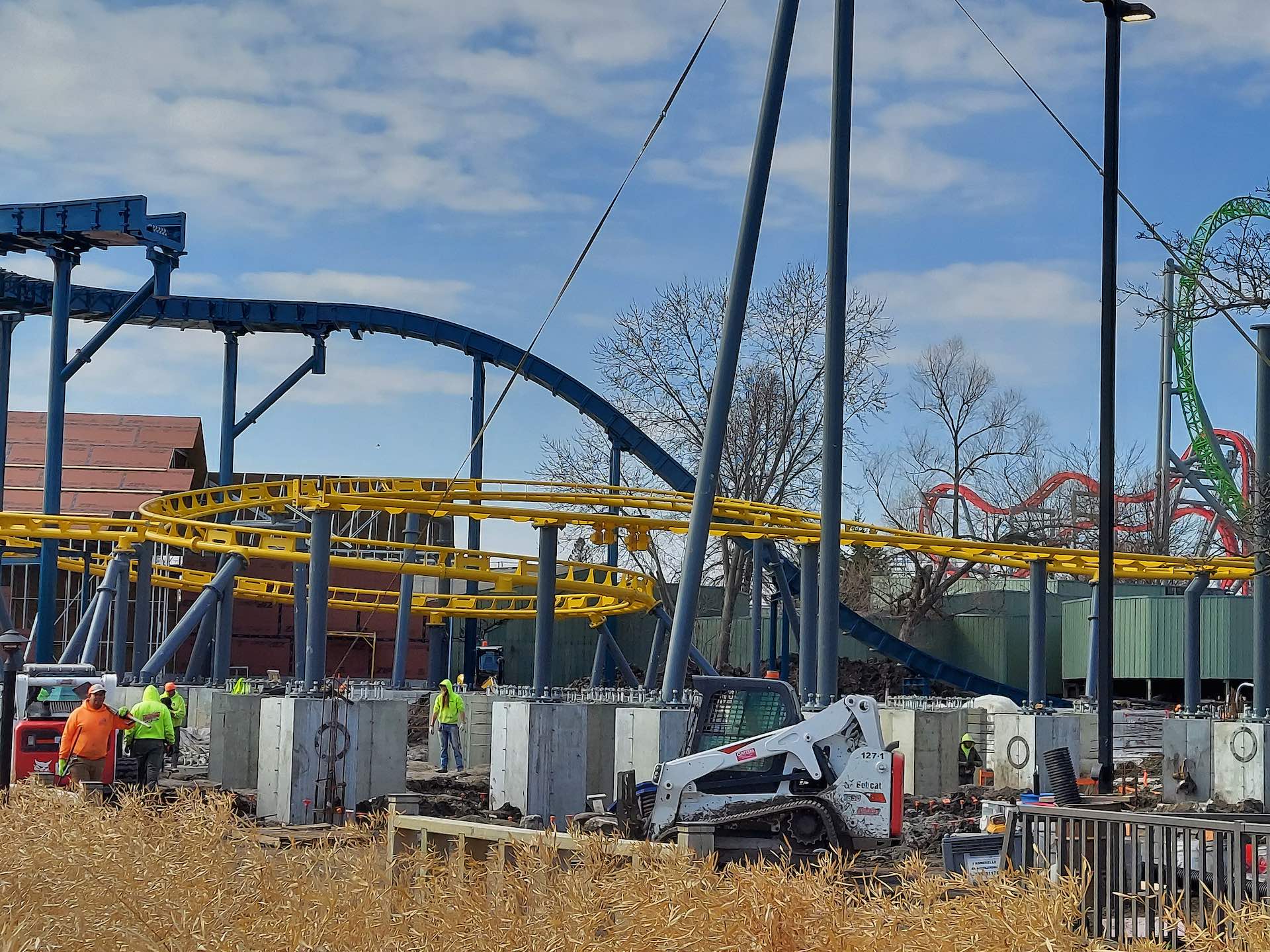 Construction showing Draken Falls (blue track), Monster (green track) and Flying Viking (yellow track). Photo: Tom Nickerson. View full-sized image.