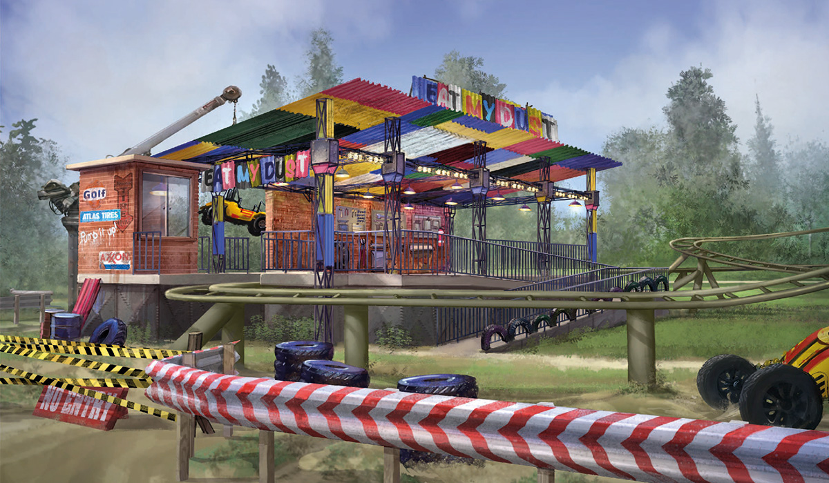 Located in the new “Speed Zone--OFF ROAD” family area, the coaster vehicles look like dune buggies and feature detailed fiberglass work and paint applications.