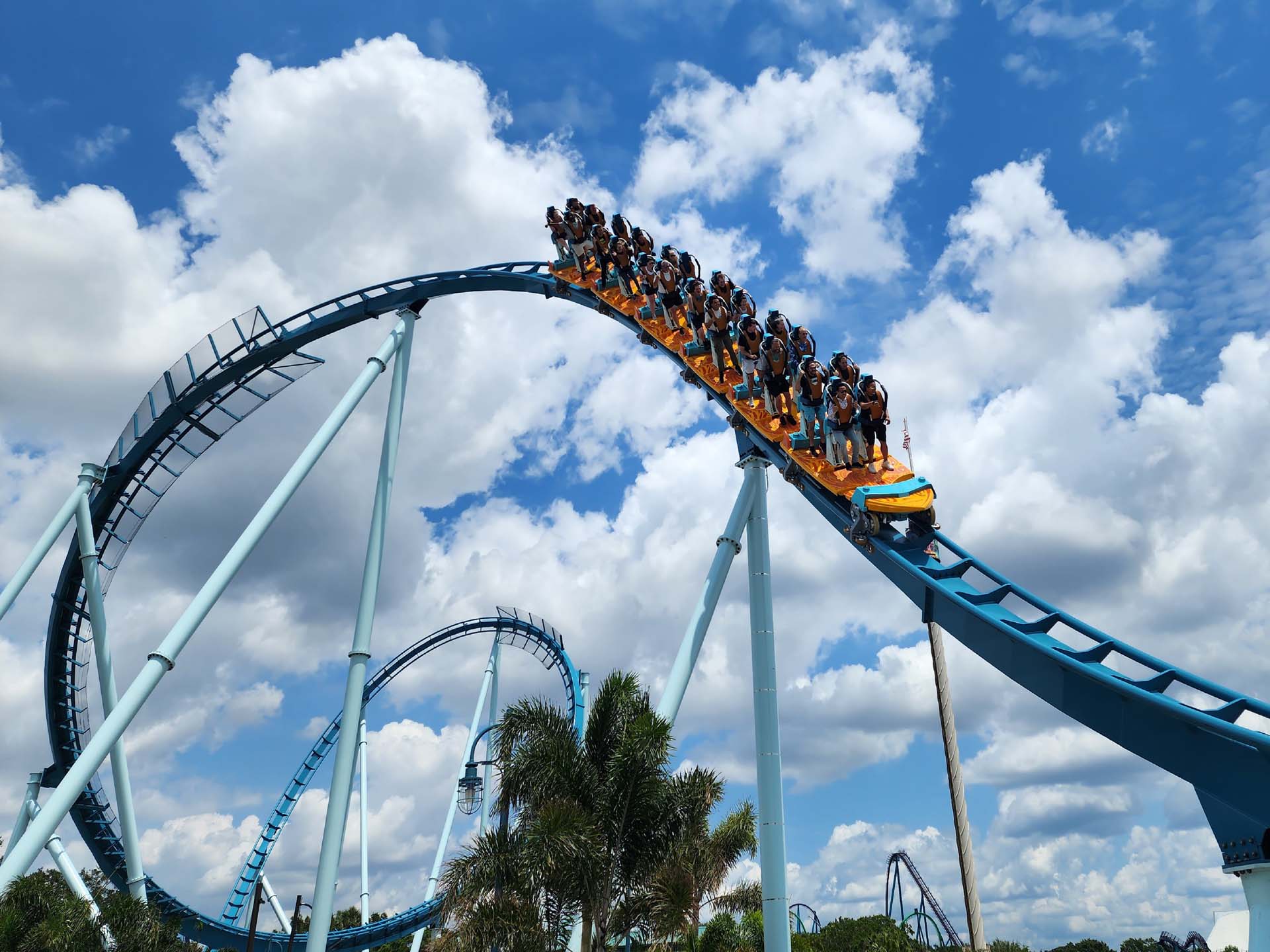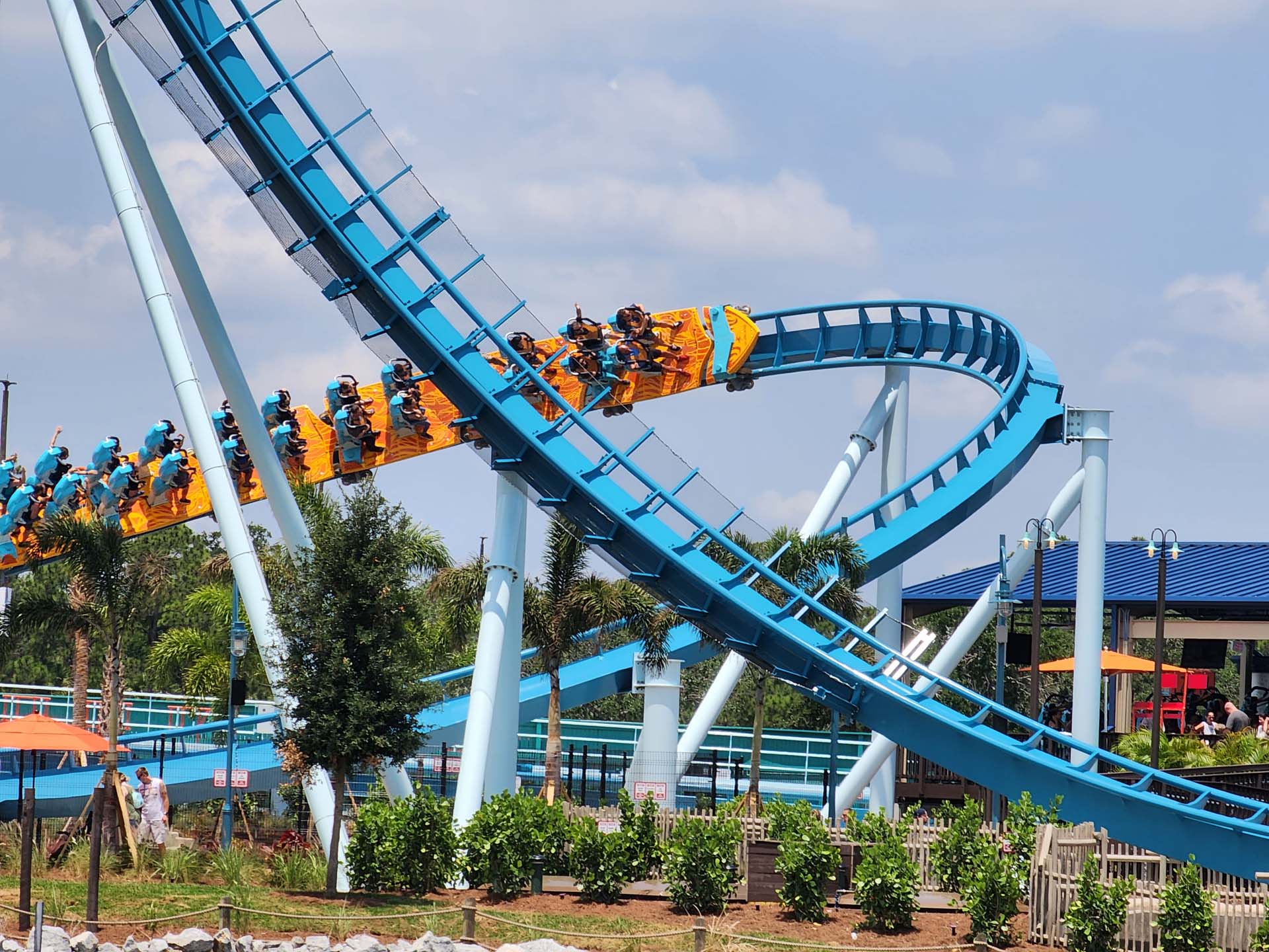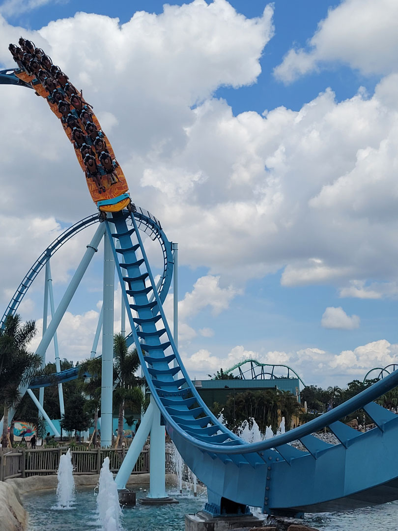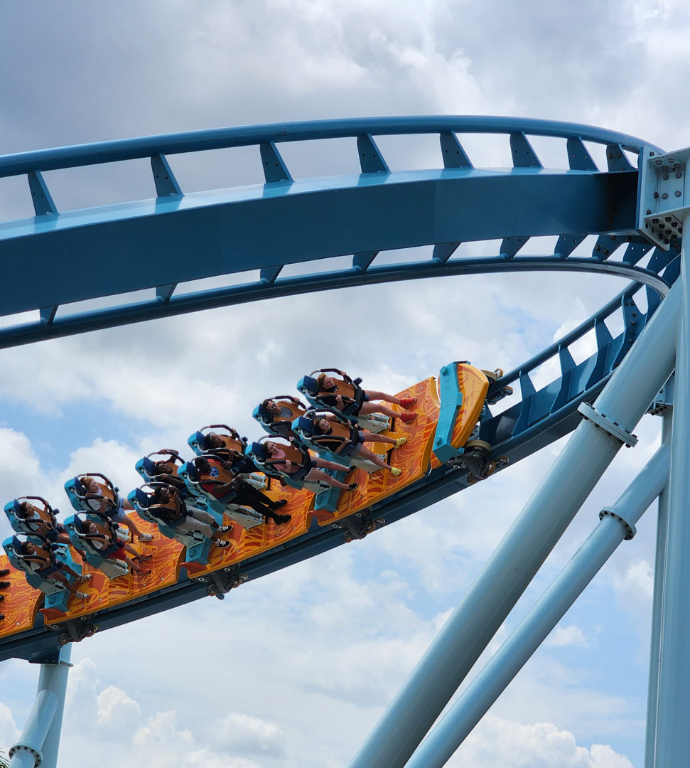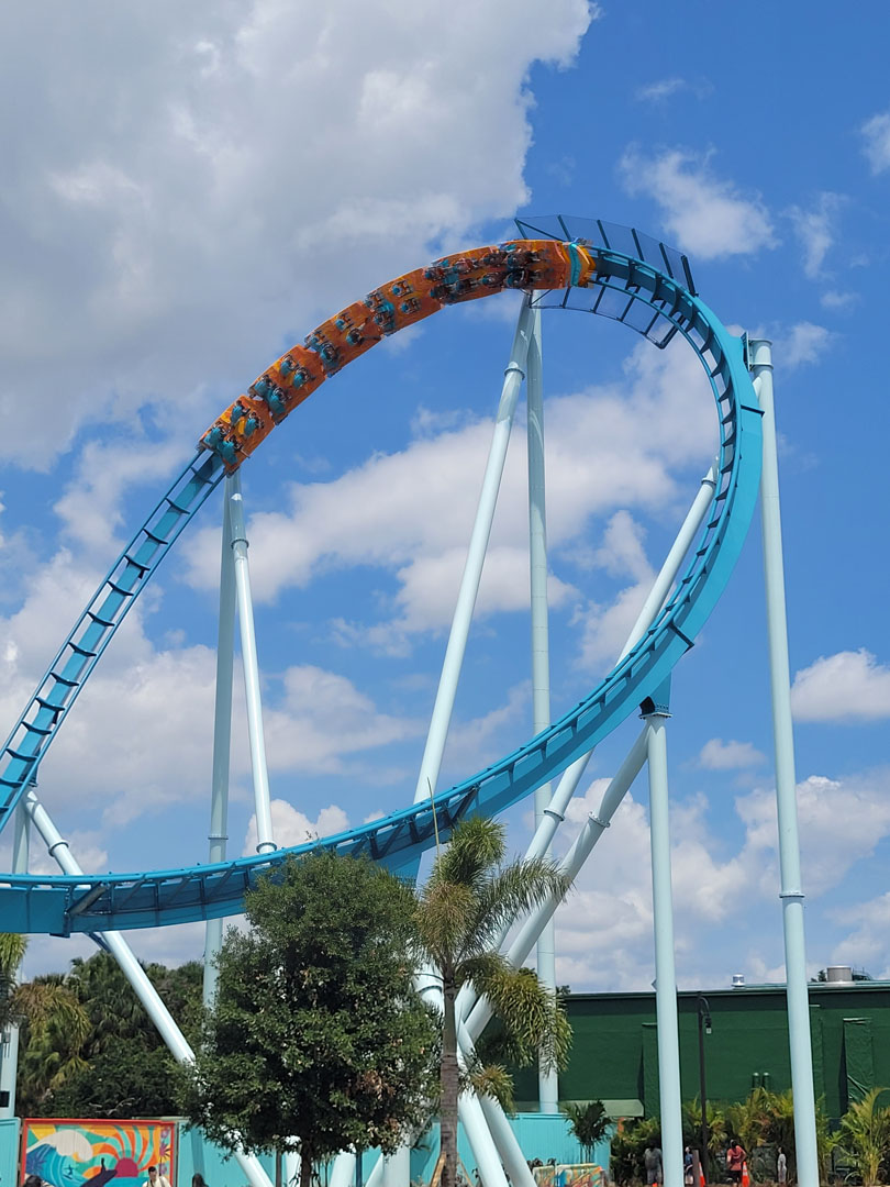 Because each seat contains a dynamic suspension system allowing generous vertical movement, the coaster’s twisted course along the shore of SeaWorld Orlando’s lagoon features true moments of airtime, including one that takes place on a small speed hill during the launch. When gravitational forces trend toward negative, the feet of riders are lifted from the floor of the vehicles to allow an amount of levitation, with only B&M’s vest restraints keeping them from freely floating into the skies above. Combined with the company’s typical sinuous twists and graceful curves to simulate the motions of the ocean, even the most critical riders will be left searching for a dull moment, simply because there isn’t one to be found.