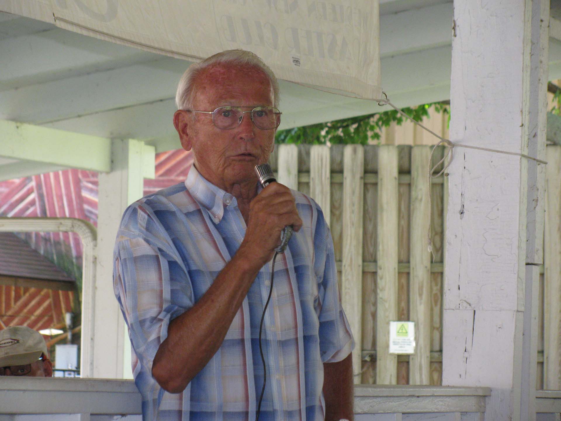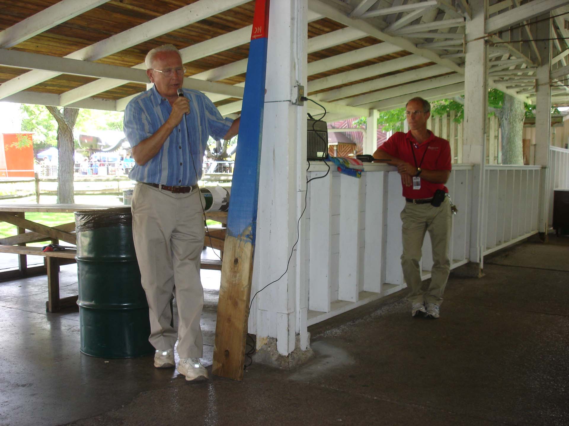 Waldameer Park owner Paul Nelson auctioning a brake handle from Comet. Observing on his right is son-in-law Steve Gorman, who will eventually assume ownership of the park.