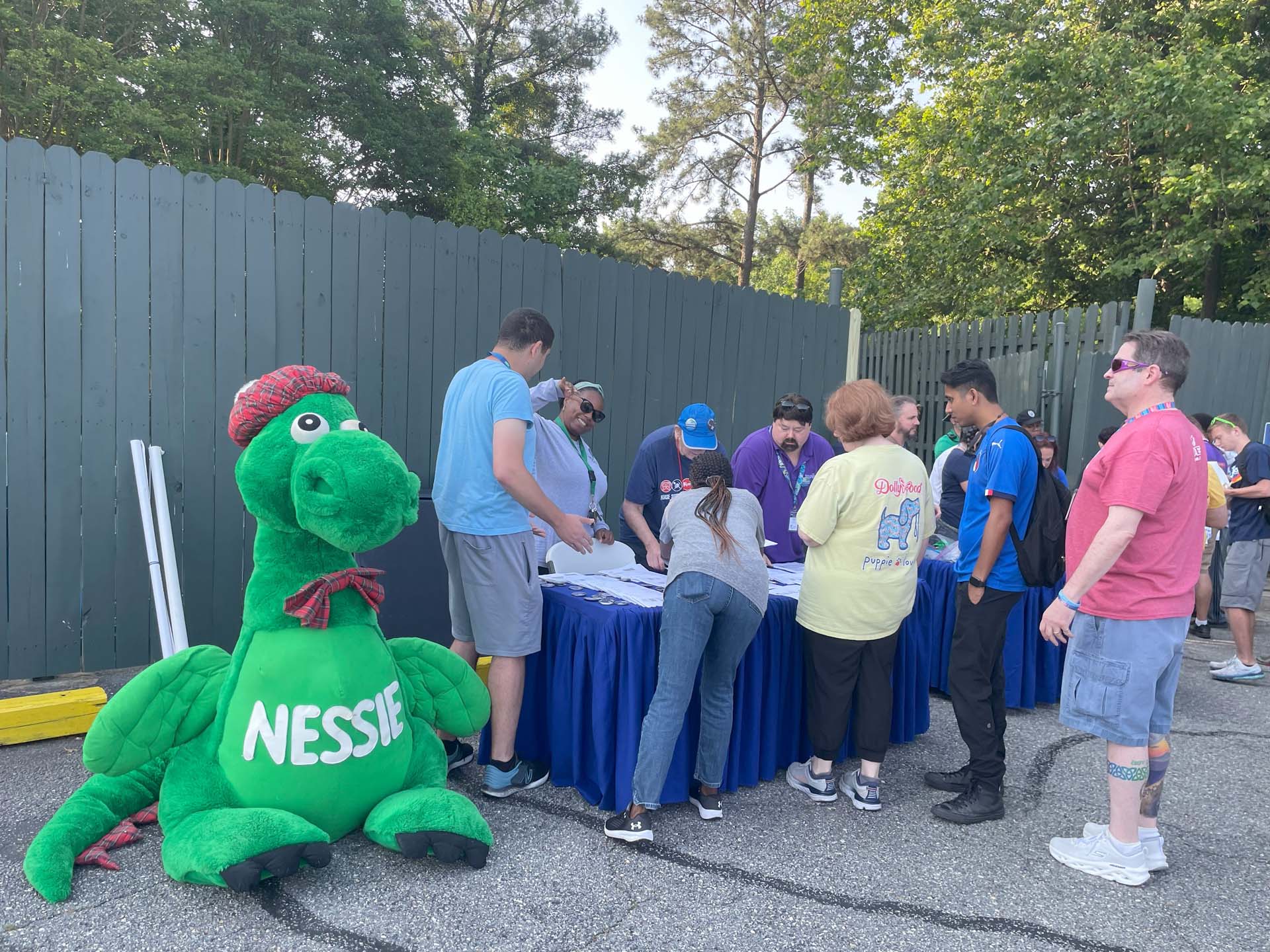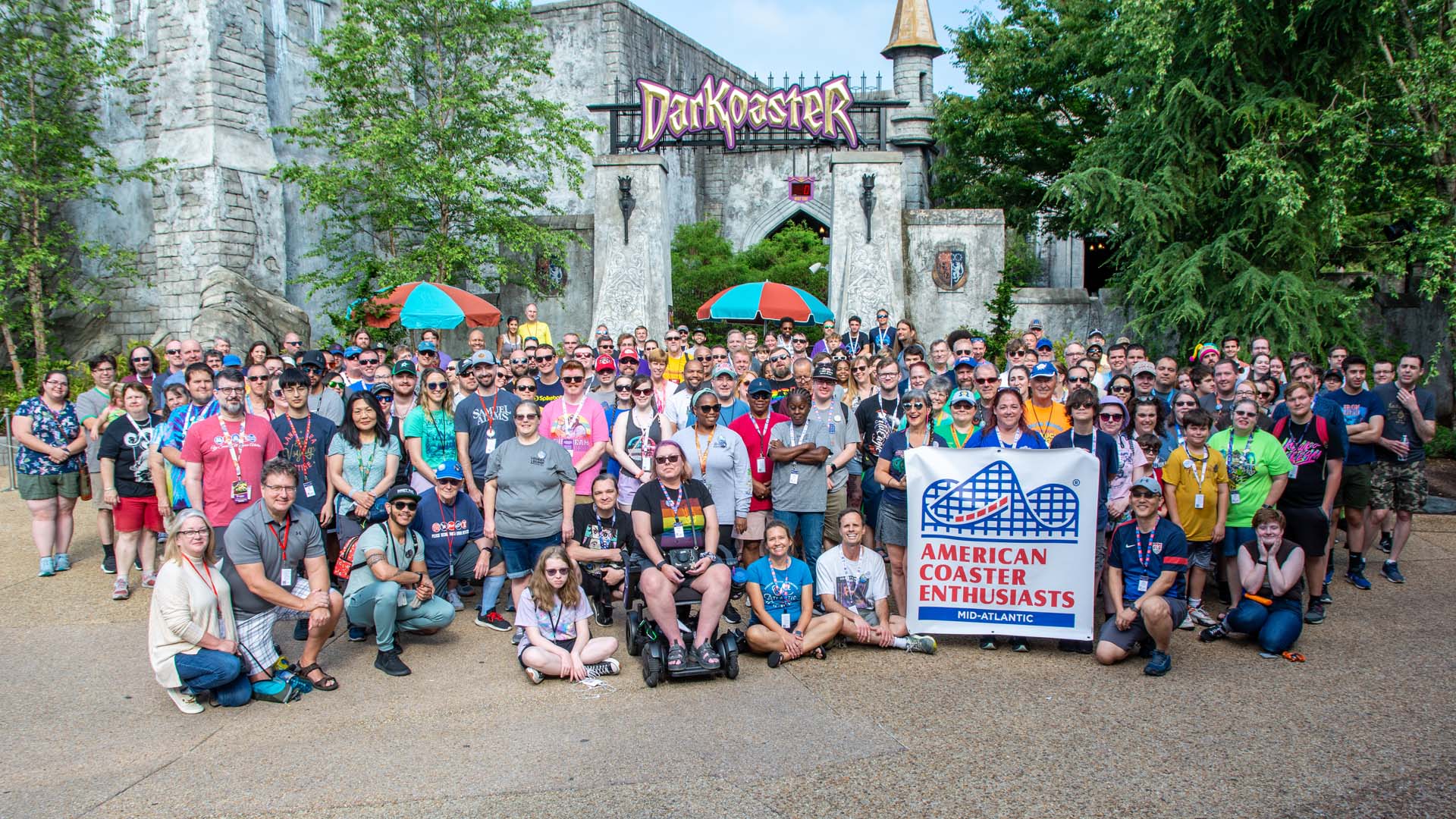 There’s something remarkable about getting together with fellow coaster enthusiasts, whether it’s the first time or the fiftieth. ACE Dives at Busch Gardens Williamsburg (Virginia) was a gala occasion — the largest ever for a Mid-Atlantic regional event — with rapid check-in and park ambassadors easily welcoming the American Coaster Enthusiasts into the park before opening. Many attendees received their Mid-Atlantic lanyards just in time for the traditional group photo, this time before ERT in front of the park’s new-for-2023 addition, DarKoaster.