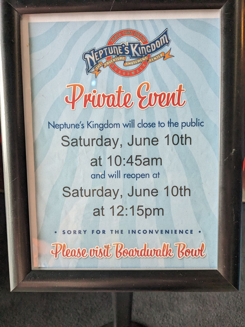 The event officially began with 90 minutes of ERT on the ACE Roller Coaster Landmark Giant Dipper. Most rides were a single time around, but several rides included two in a row and the last ride of the session included three laps. There was a brief stop outside Giant Dipper when outgoing ACE Northern California Regional Representative Nicholas Laschkewitsch helped to open the park for the day.