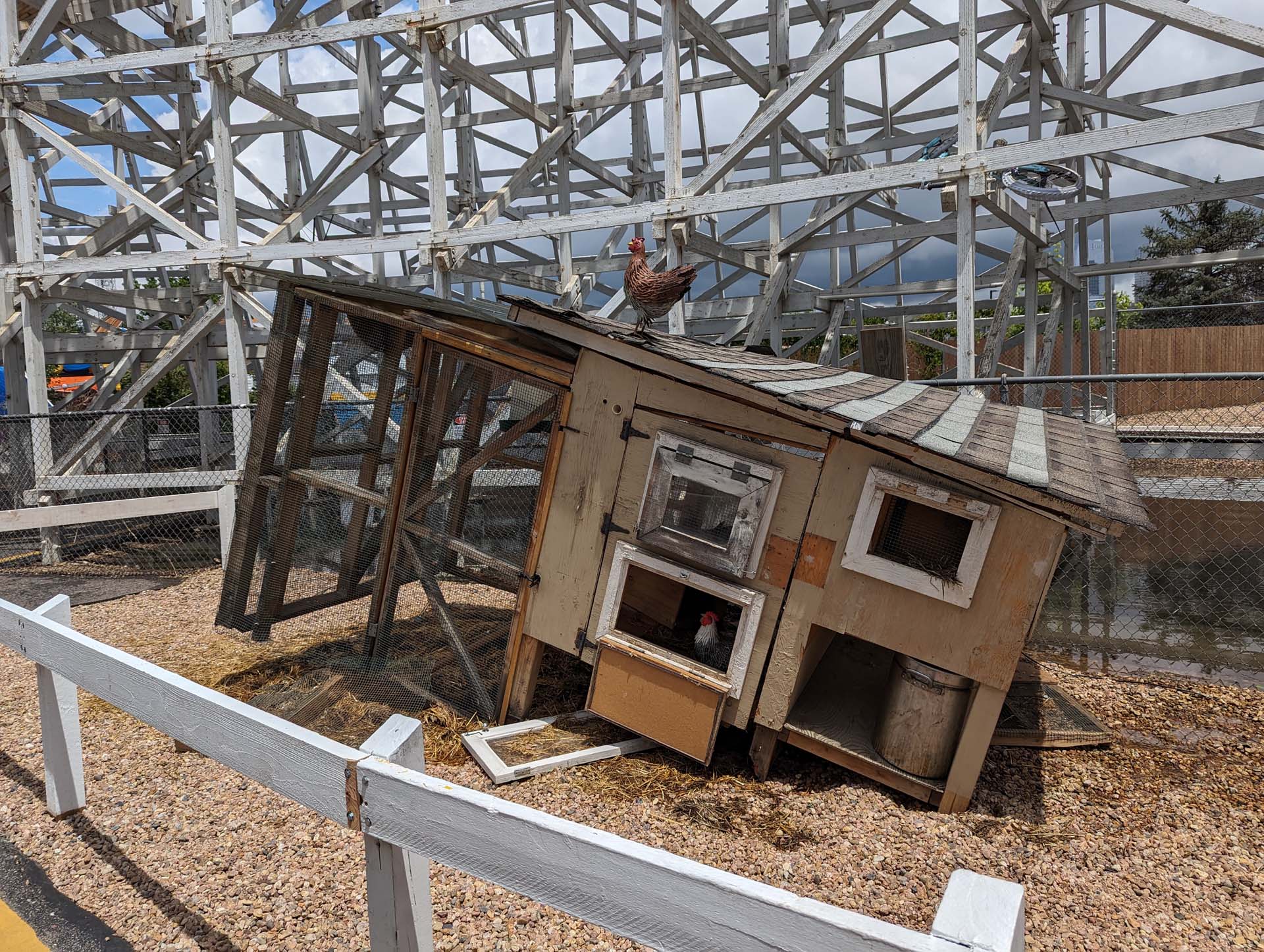 Guests are greeted at the coaster’s entrance by a cow thrown through the roof, complete with cow moans radiating from speakers. As the queue area is entered, the sound effects transition to those of a storm with wind, rain and sirens. Continuing on, guests experience the storm’s devastating aftermath by passing through a flooded area with overturned boats, a chicken coop, camper and storm chaser vehicle.