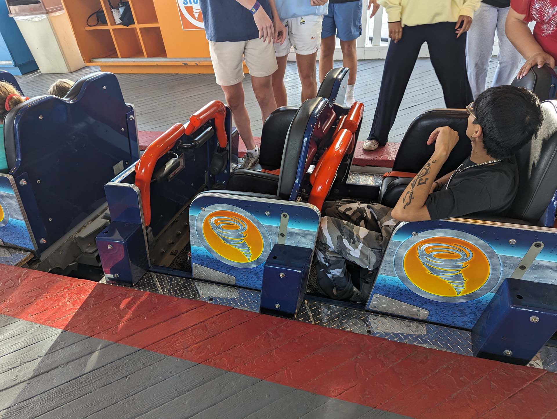 Having finally reached the loading platform, guests encounter Twister III’s freshly painted trains with new padded seats, seat belts and lap restraints providing a much more comfortable ride experience. As for the ride itself, the first drop has been rebuilt to be taller than before, providing some nice ejector airtime cresting the first hill. The blackout tunnel was made a little longer, and flashing lights have been added to create lightning effects in keeping with the coaster’s new storm theme.