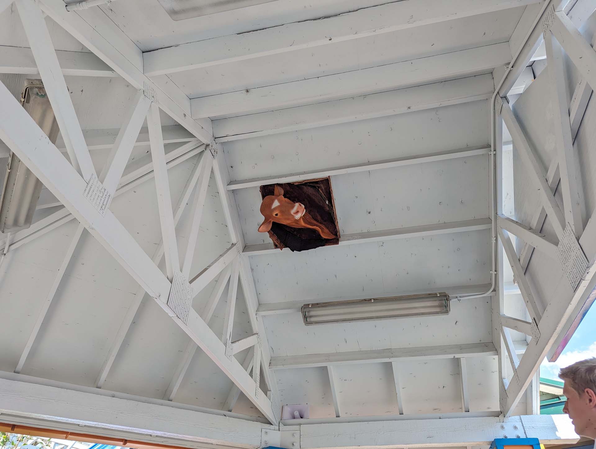 Upon entering the queue, guests are welcomed by a cow having been tossed through the roof by the storm.