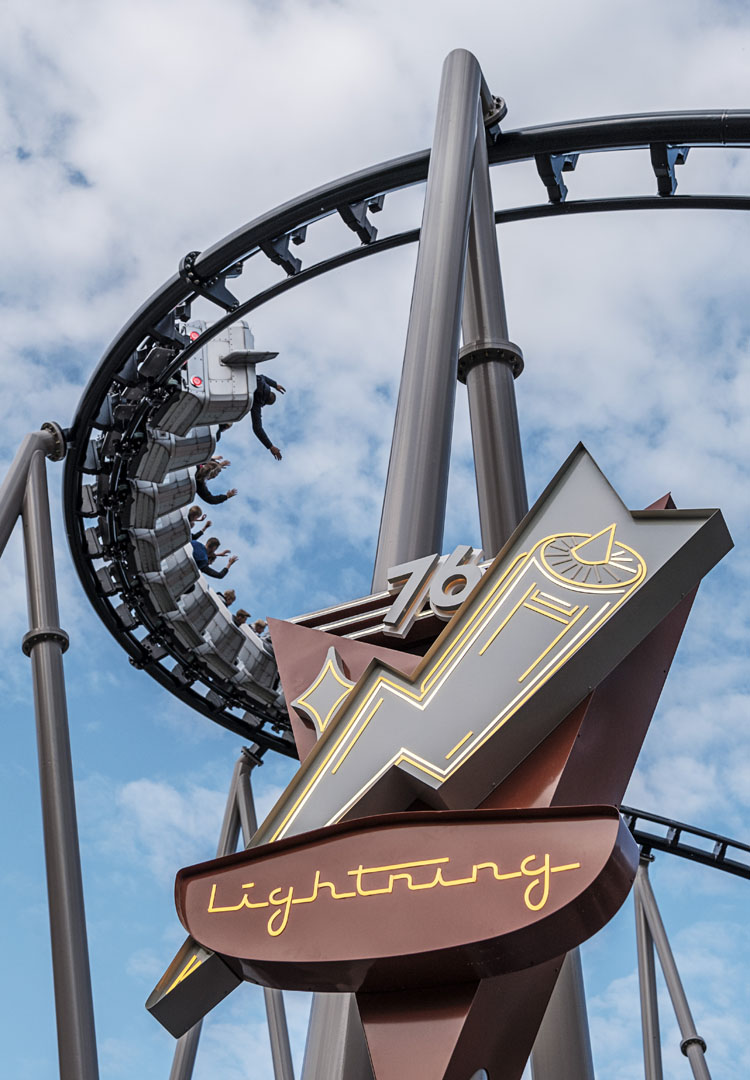 Lightning’s steampunk-themed train traverses the coaster’s layout specifically designed to allow the ride operator to decide between single- and double-lap operations, creating the possibility of two different ride experiences.