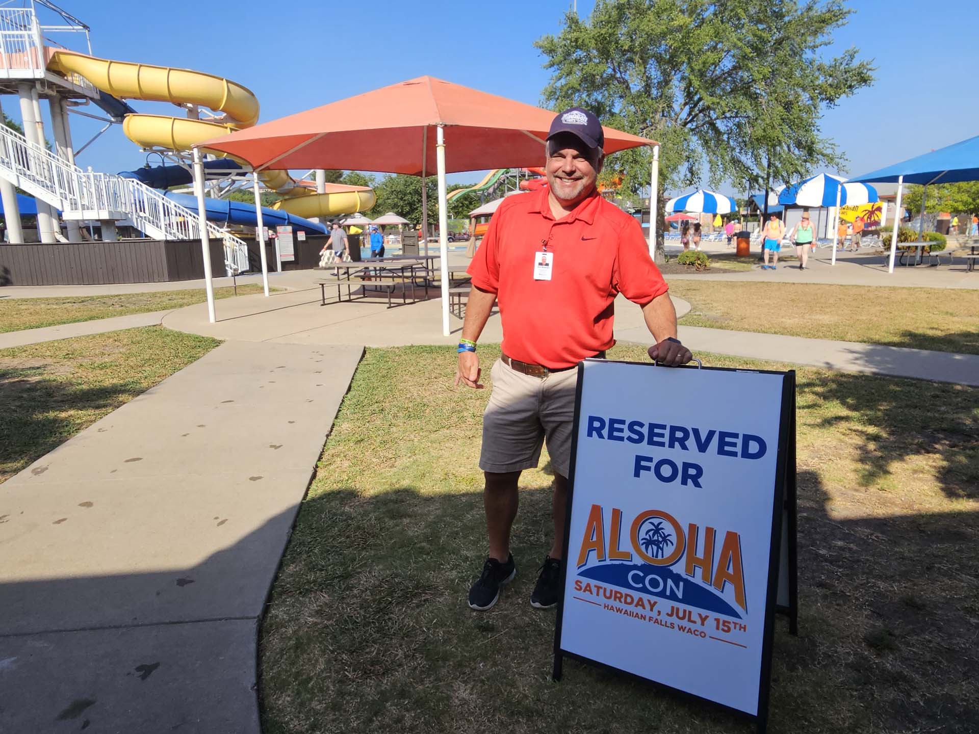 Ron McKenzie welcomes members to a reserved pavilion inside Hawaiian Falls for many of the event’s activities.