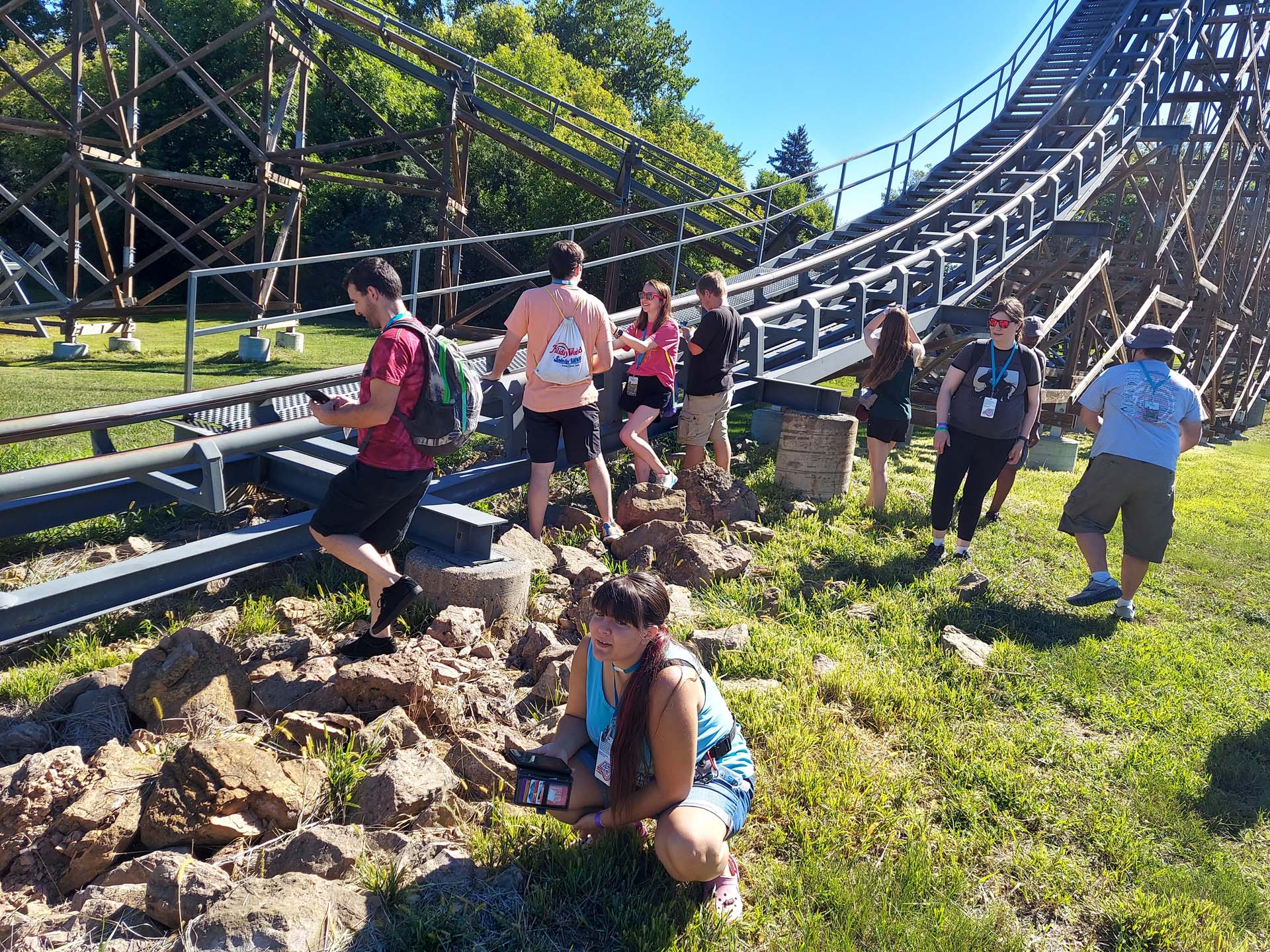 As soon as the park opened to the public, attendees headed to the back of the park. The first activity of the day was to tour the infield of Valleyfair’s 1989 Arrow Dynamics wood structured steel coaster, Excalibur. This coaster has been a topic of conversation for many years — some enthusiasts love it while others hate it. There have even been rumors of its removal over the years. During the tour ACE members asked some of their most burning questions to Rides Manager Tom Soul and Maintenance Manager Jim Boone. Soul has 45 years of experience with Valleyfair, and Boone has 31 years, so there wasn’t a question they couldn’t answer.