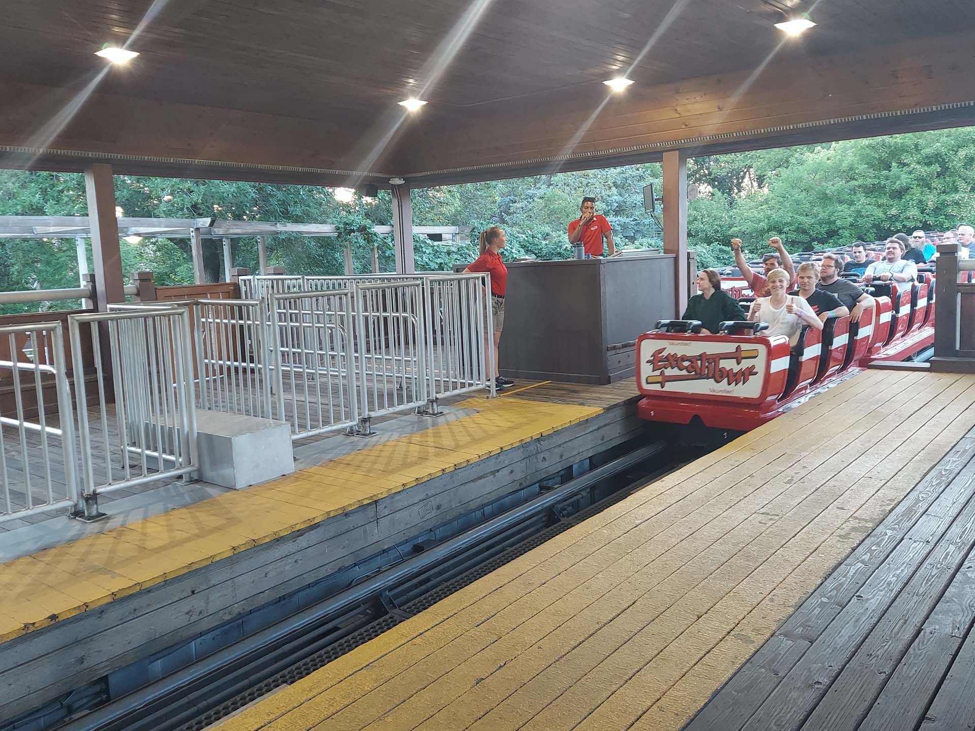 Considered a close relative of Gemini at sister park Cedar Point (Sandusky, Ohio), Excalibur also shares a lot in common with Arrow’s mine trains in that it features tubular steel rails atop a structure constructed primarily of wood.