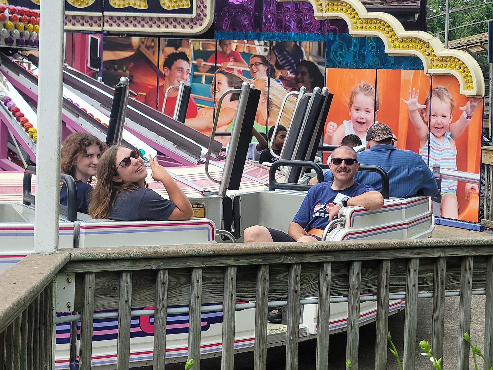 It being a warm, sunny day, many park visitors headed directly to Water World, so most event attendees who wanted to try out Waldameer’s new water coaster, Rocket Blast, waited until the initial rush was over. Informal takeover times (ITOTs) were scheduled on popular Waldameer rides, beginning with the Bill Tracy walkthrough Pirates Cove, followed by Steel Dragon, the park’s Maurer Rides spinning coaster. The ITOT on the Dodgems led to much hilarity, then everyone chilled out on the L. Ruth Express train ride around the park. The last ITOT before dinner was on Whirlwind, the SBF-Visa Spinning Coaster.