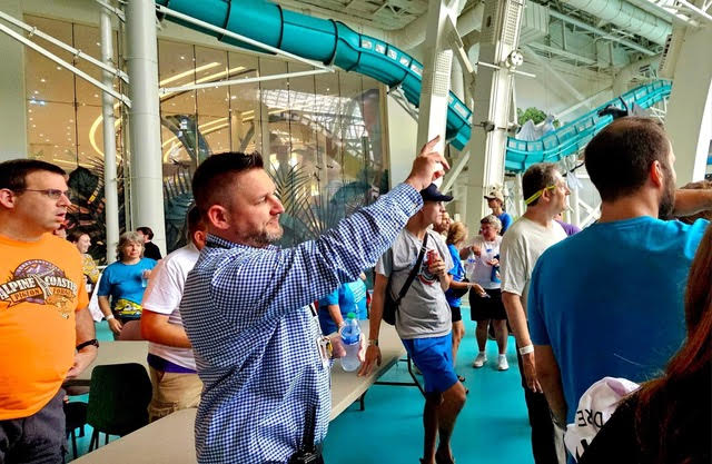 American Dream guide and “man of many hats” Bobby Fischer points out many of the features of the Dreamworks Water Park, with the DreamWorks Dream Runner water coaster above attendees.