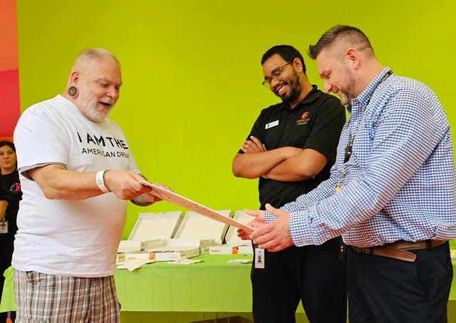 Davidson presents the American Dream staff with a thank you card signed by event attendees.