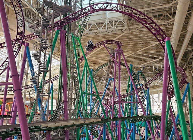 Nickelodeon Universe is a stunning site constructed within American Dream — a large retail and entertainment center in the Meadowlands of New Jersey. It covers 85 acres and offers more than 30 amusement rides. Guests are treated to a full view of the entire park while entering on an escalator from the mall level above. The abundance of colorful rides and intricately entwined roller coaster track is a unique and impressive sight.
