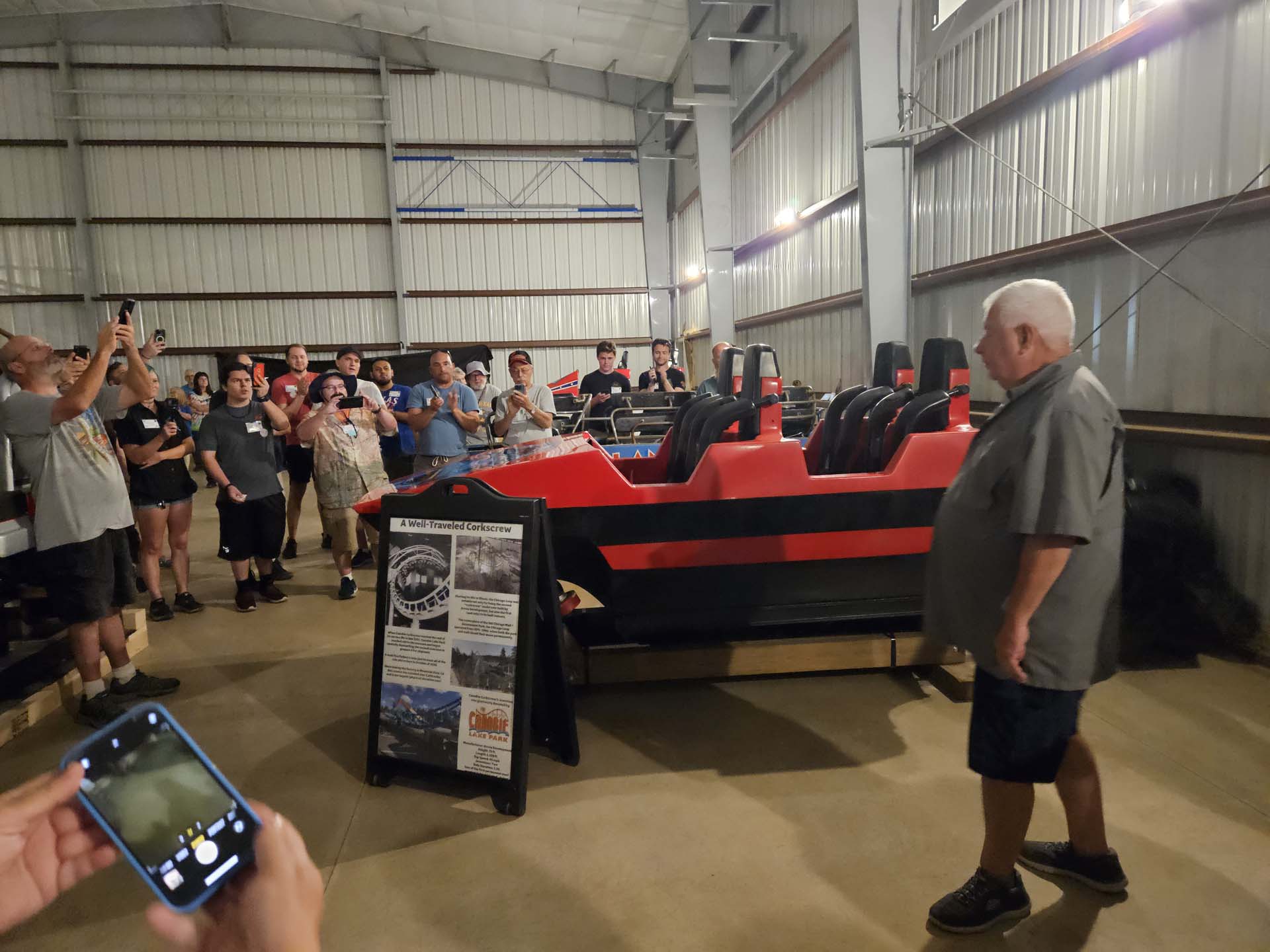 Amusement Today Owner and Publisher Gary Slade unveils the lead car from Canobie Corkscrew – one of the NRCMA’s more recent acquisitions and intended to be displayed with a complete corkscrew element from the defunct ride.