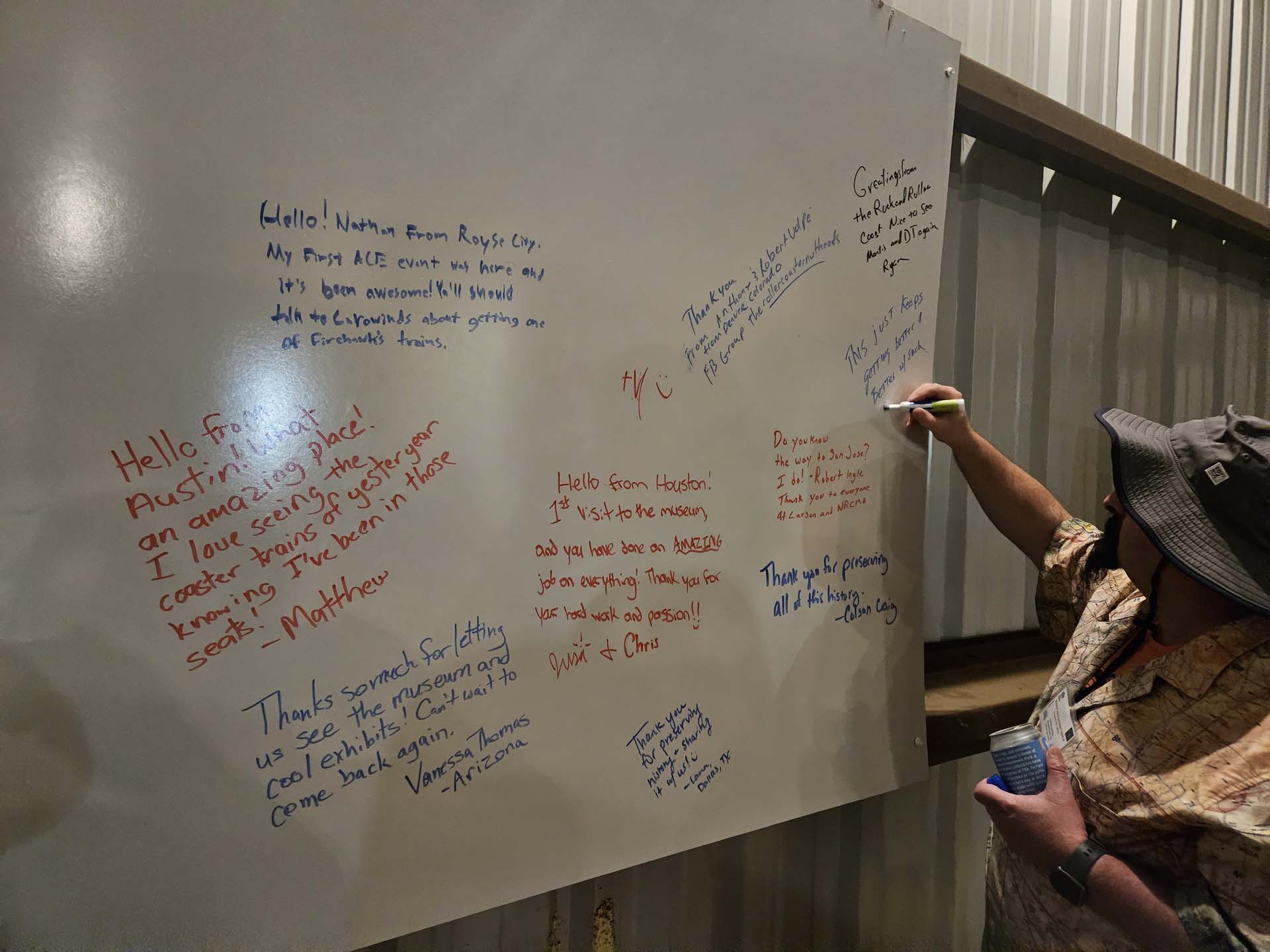 Attendees take full advantage of a whiteboard to leave messages of thanks and appreciation to the NRCMA for its preservation efforts.