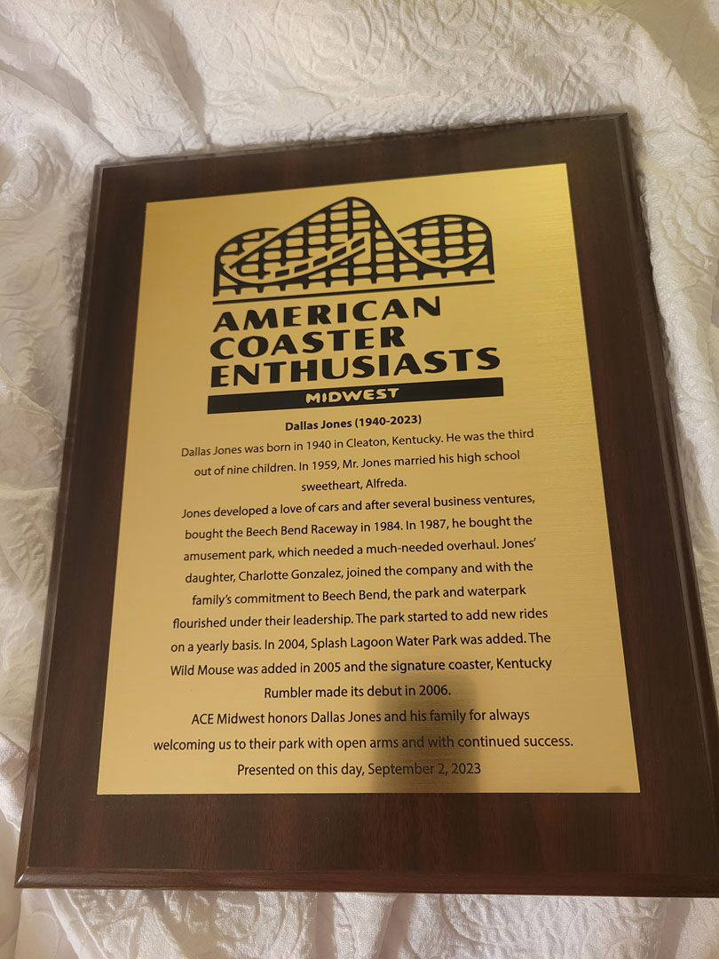 The highlight of the event came at noon when Regional Representative Bob Redman presented a plaque honoring the late Beech Bend Park and Splash Lagoon owner, Dallas Jones, who passed away earlier this year. The plaque mentioned the park’s welcoming nature regarding ACE members and wished it continued success.
