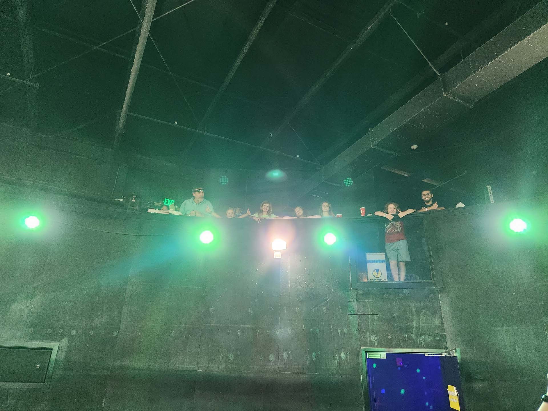 The winners of the contest to guest DJ on the park’s Centrifuge take a break from their duties to pose for a photo.