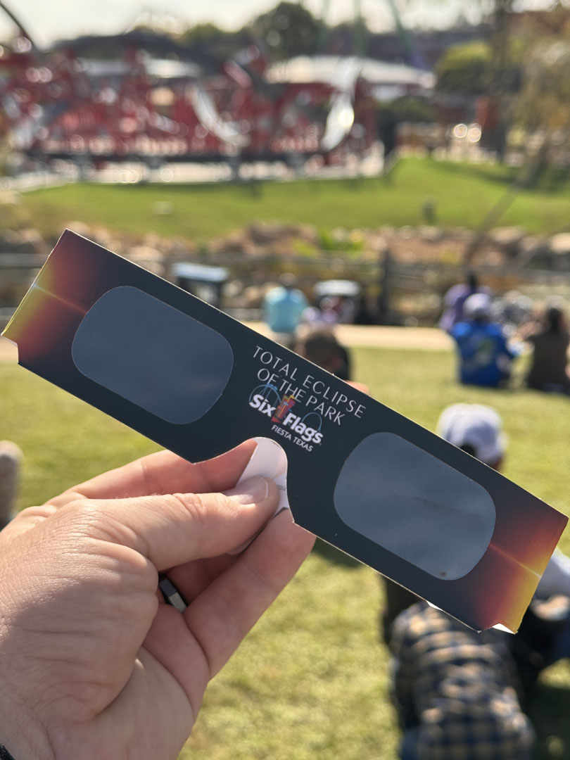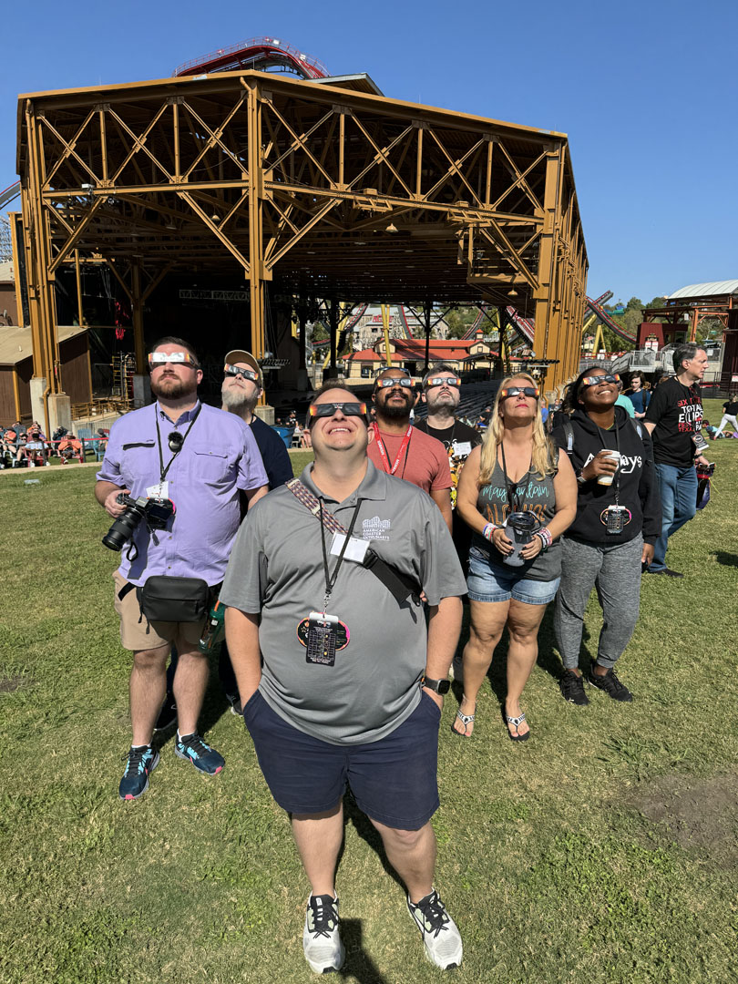 The park opened early because of the solar sideshow. Before long, the lawn where guests typically enjoy the nighttime fireworks show was populated with star watchers, ACE among them. Armed with special viewing glasses, everyone enjoyed the rare celestial event. The park had fun with it by setting off some fireworks and sending up some lighted drones.