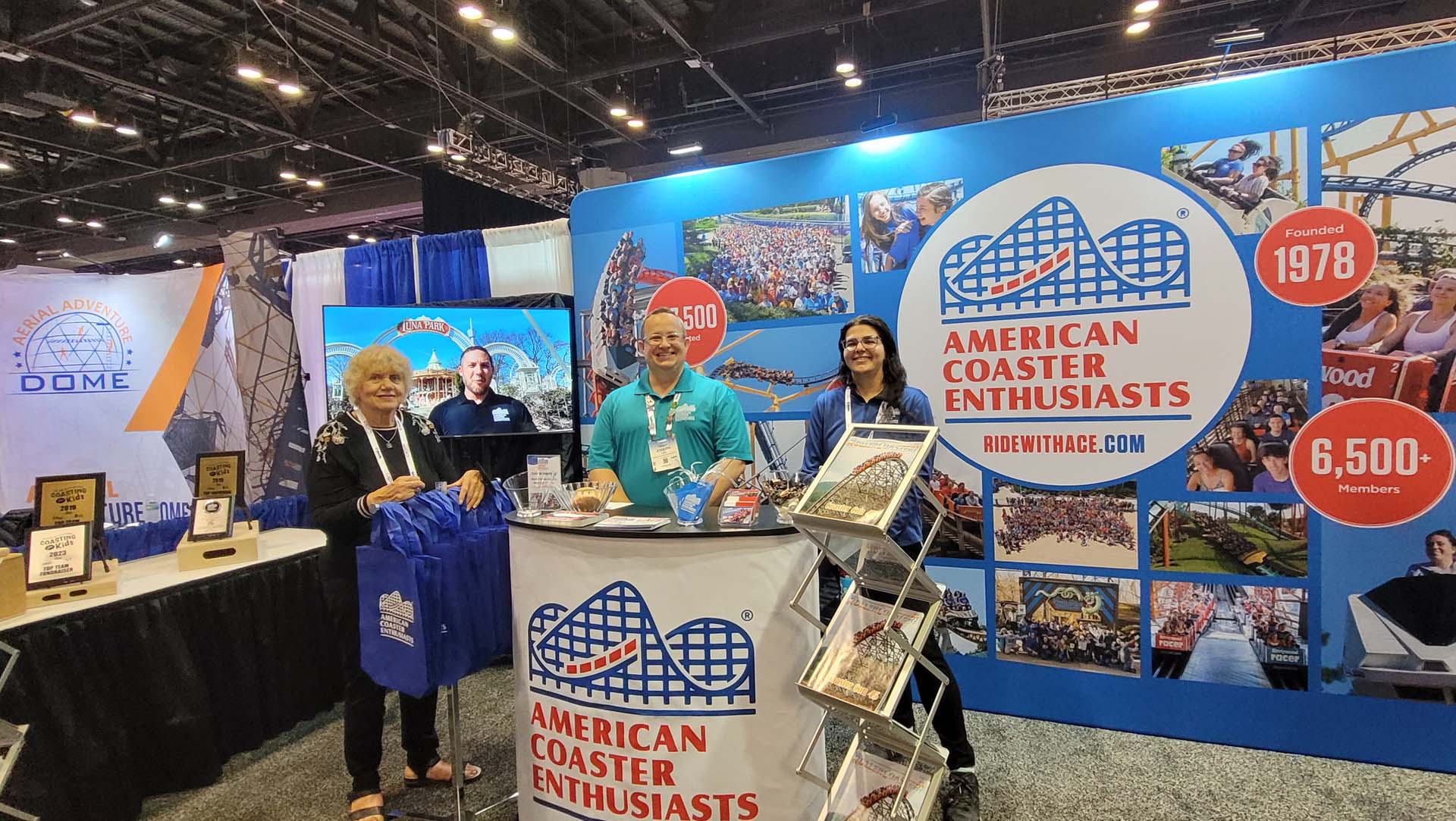 Over the last few years, ACE has seen a significant increase not only in the number of visitors to its booth (particularly earlier in the week) but the intention of expo attendees to visit the booth. Well-known industry representatives and ACE members such as Deno and John Vourderis of Deno’s Wonder Wheel Amusement Park (Brooklyn, New York), Chris Ozimek of Schlitterbahn, Jeffrey Siebert of Six Flags Fiesta Texas (San Antonio), Mark Rosenzweig of 3dxScenic, the Irvine-Ondrey Engineering team and Dick Knoebel of Knoebels Amusement Resort (Elysburg, Pennsylvania) dropped by. Other visitors included Sam Rhodes of Six Flags, representatives of ZooTampa at Lowry Park (Tampa, Florida), the new owner of Huck Finn’s Amusement Park (Albany, New York), Alex Payne of Adventureland (Altoona, Iowa), Andy Hygate of Blackpool Pleasure Beach (England), Jerry Brick of Palace Entertainment, along with representatives of Vekoma, Intamin, Universal, Cedar Point, Sally Dark Rides, The Gravity Group, Kirby Family Farm and countless others.