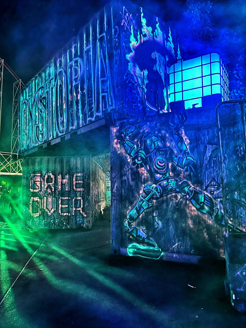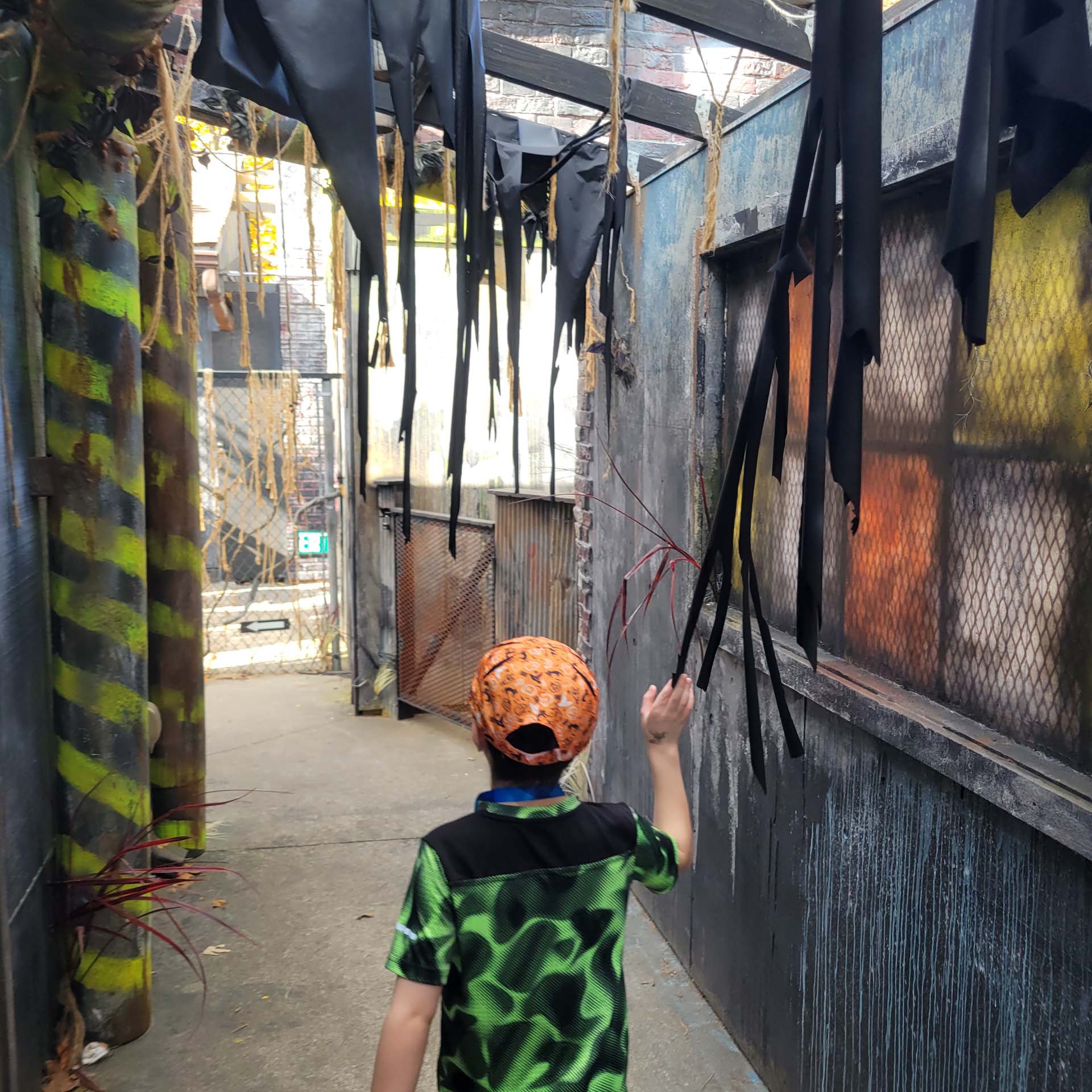 Attendees navigate the Ghost in the Machine haunt during a daytime behind-the-scenes tour.