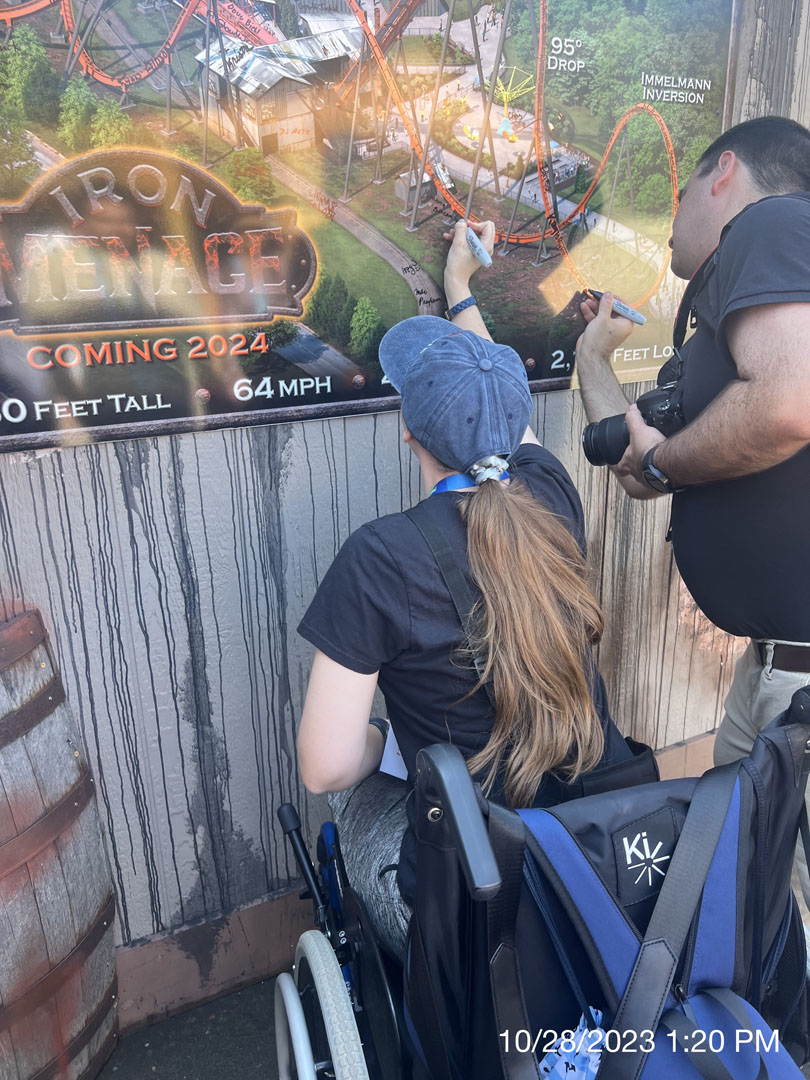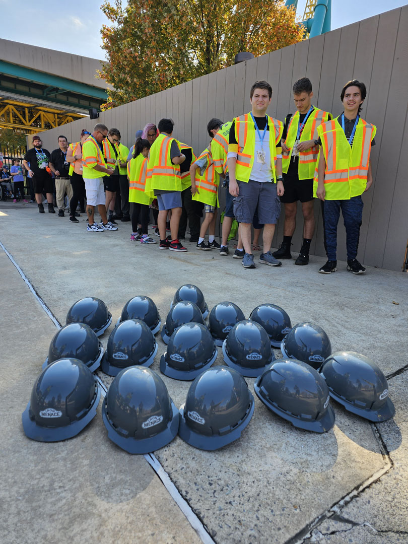 The Iron Menace construction tour included special hard hats and the signing of a poster that will be displayed somewhere near the completed coaster.