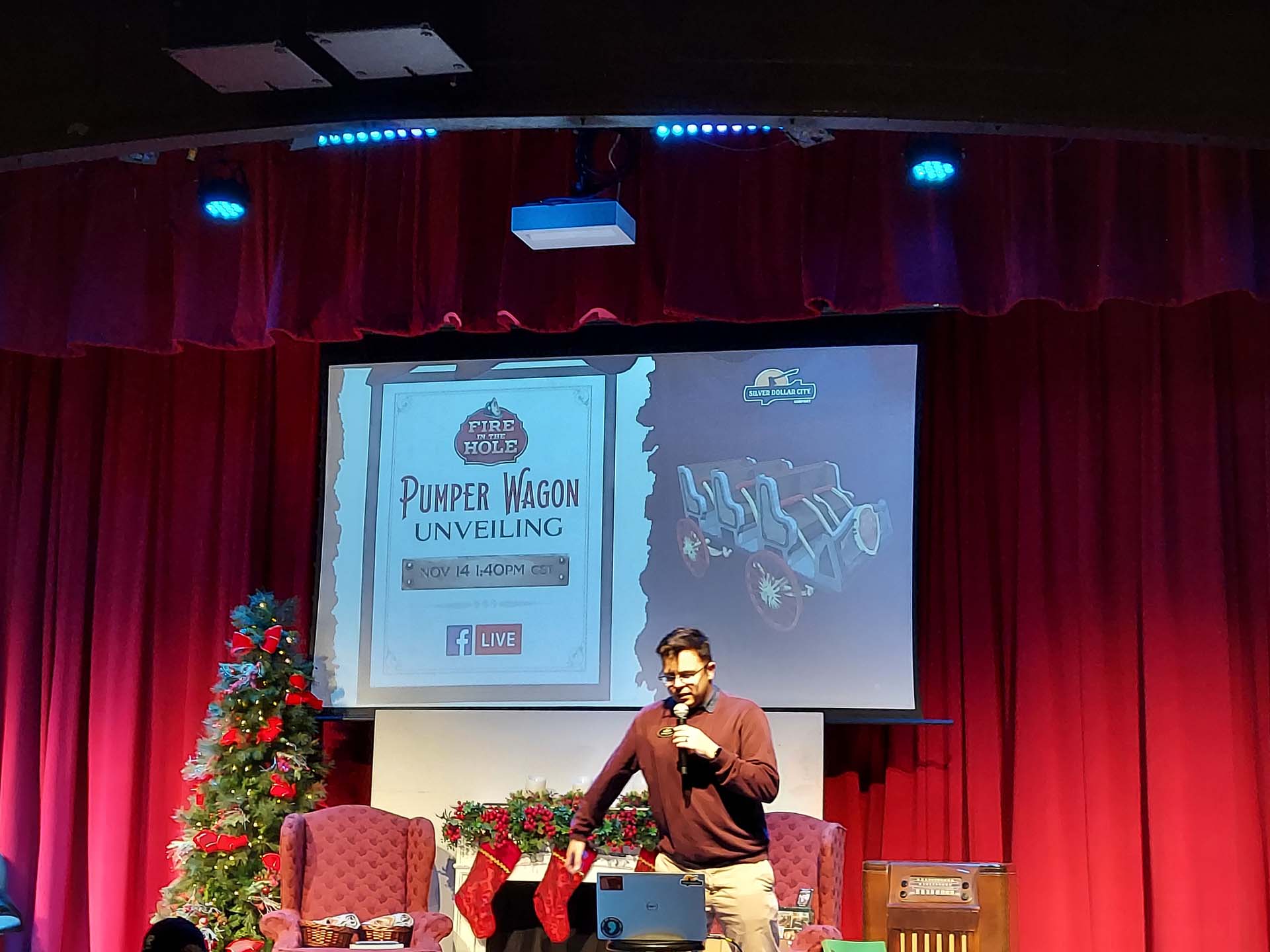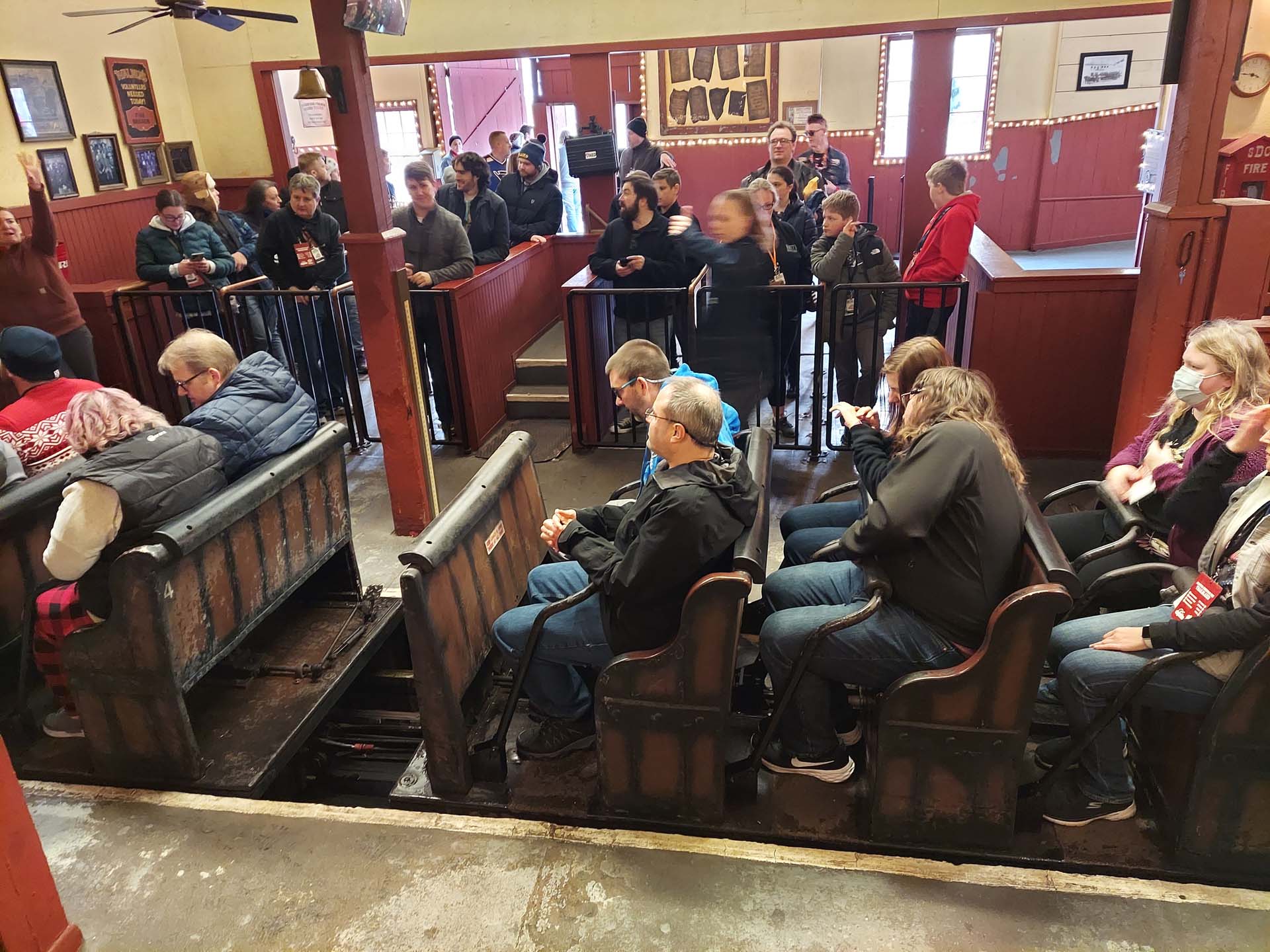 Once everyone was done with lunch, it was time to see the new Fire In The Hole. Originally there was supposed to be a tour of the ride, but unfortunately with RMC’s crew in the building and parts of the ride in motion, attendees were not able to head inside for a look. A few surprises remained though, as it was announced that everyone attending Coaster Christmas would get a park ticket to use during the 2024 season and become a permanent part of the new Fire In The Hole’s theming, as attendees’ names would be installed on a list of Marmaros Missouri firefighters to be placed somewhere in the ride’s queue.