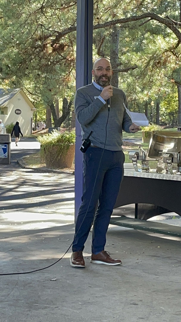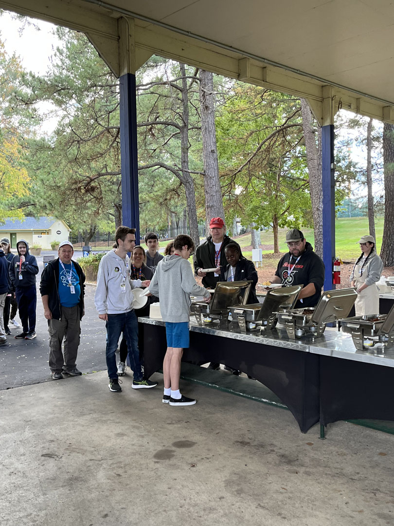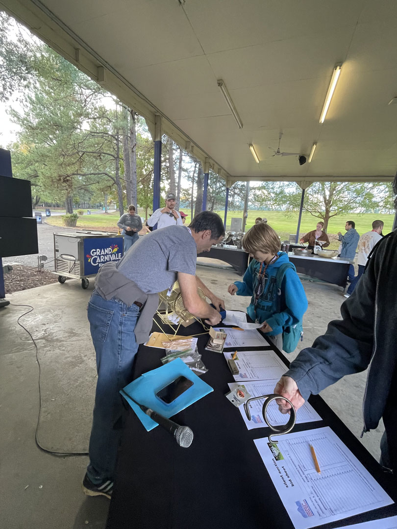 At 1 p.m. the crowds had still not arrived but some rain clouds started appearing over the park. After members rode Boo Blasters, making a note of their score for a chance at a prize later in the event, they hurried to the picnic grounds, most beating the downpour that arrived just after 1:30 p.m. As usual, the food was delicious, with smoked brisket served for the first time at this event. While folks ate, they also had the opportunity to bid on several silent auction items and get to know their fellow attendees through a Bingo game.