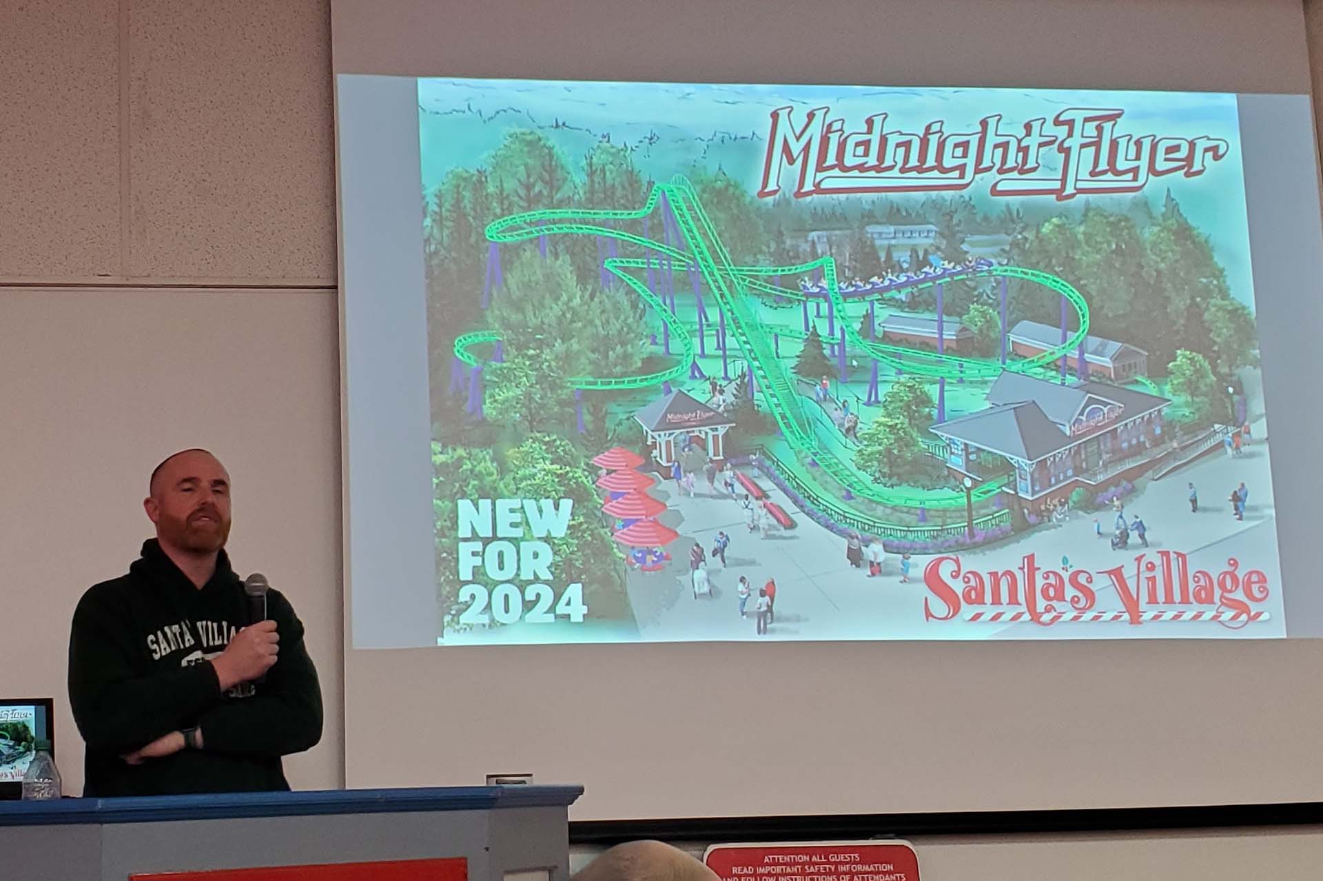 The next park presentation was made by Christian Gainer, a last-second (and very welcome) addition to the lineup. Attendees were glad to have him share details about the brand new Midnight Flyer roller coaster being installed at Santa's Village — a small family-owned theme park in Jefferson. New Hampshire, run by the Gainer family. He talked about struggles with the former Rudy's Rapid Transit, noting that the repairs and upgrades needed on the aging coaster would have taken it out of commission for up to two years (it will reportedly live on at another amusement park).