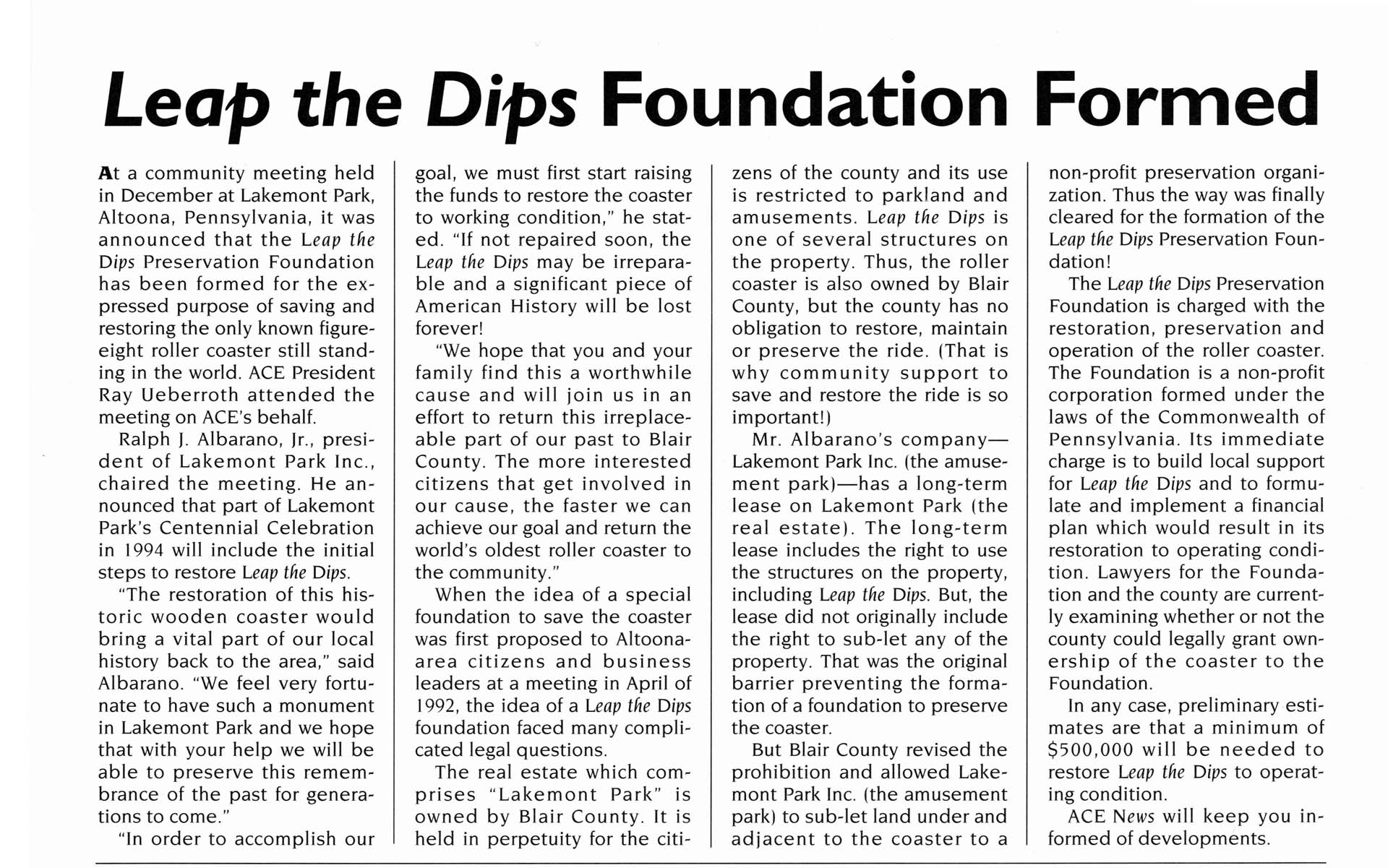 It is sobering (but also inspiring) to read that in January 1994, ACE President Ray Ueberroth attended a community meeting held at Lakemont Park in Altoona, Pennsylvania, led by Ralph J. Albarano, Jr. Albarano was president of Lakemont Park Inc., which was announcing initial steps to restore Leap The Dips with the formation of the Leap The Dips Preservation Foundation. We now know the effort to save Leap The Dips succeeded, and the historic ride (and the world’s oldest roller coaster) reopened in 1999, thanks to considerable assistance from ACE.