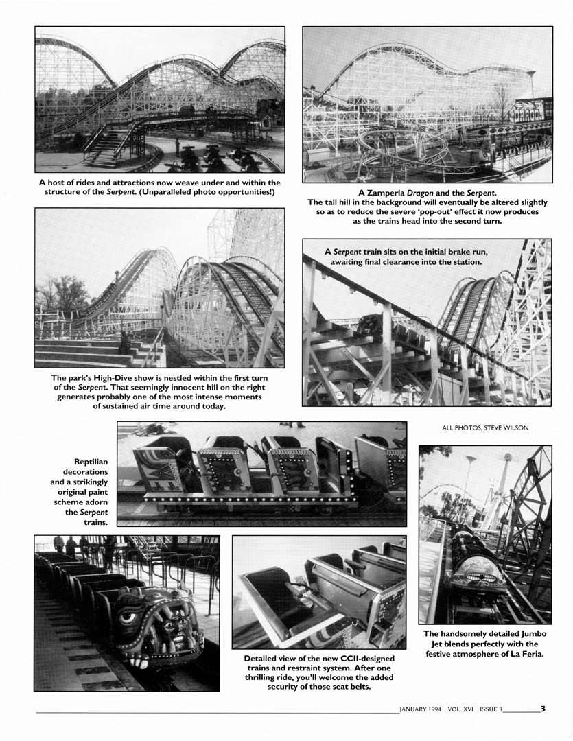 This issue’s subject matter contains a lengthy article about the rebirth of Mexico City’s La Montaña Rusa — significant because the enormous racing woodie was recently demolished as part of an evolution of the long-standing amusement park located in Chapultepec Park. Also selected was an article about the formation of the Leap The Dips Foundation, having significance in its own right owing to the recent announcement of the closure of the amusement rides at Lakemont Park (Altoona, Pennsylvania). Rounding out the pieces chosen were construction updates for Raptor at Cedar Point (Sandusky, Ohio), Comet at Great Escape (Queensbury, New York) and the Arrow Dynamics hypercoaster that would become Desperado at Buffalo Bill’s Resort and Casino (Primm, Nevada).