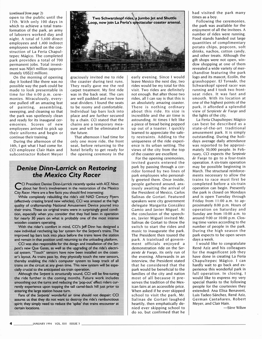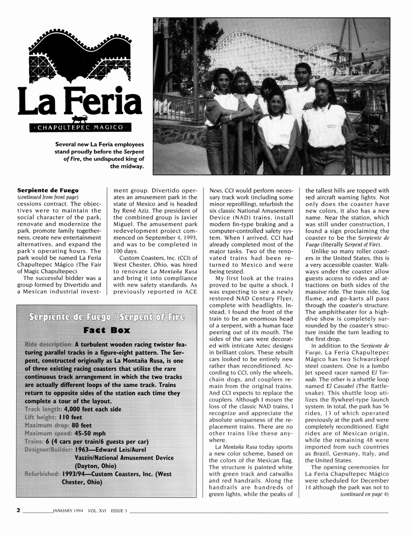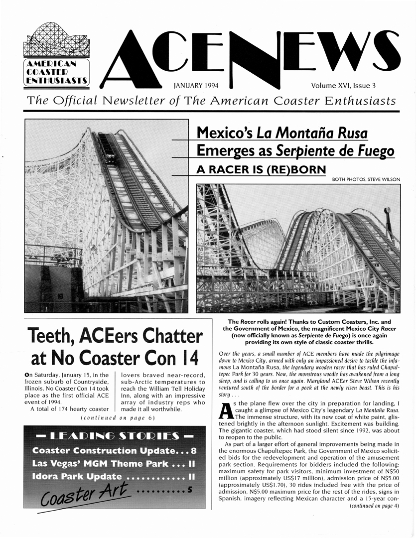 It was wonderful to re-read the January 1994 issue of ACE News, but it was also quite sobering. Though modern new marvels under construction were featured, such as Raptor at Cedar Point (I still find it hard to believe that Raptor is 30 years old this year), like today, preservation was even then an important topic for wooden coasters. Montaña Rusa was undergoing extensive renovation by Custom Coasters, Inc., and the former Crystal Beach Comet was taking shape at The Great Escape. Several years later, both coasters would be named ACE Roller Coaster Landmarks — Comet in 2009 and Montaña Rusa in 2017. Fortunately, Comet is still very much with us at Six Flags Great Escape, thrilling another generation of riders in the Adirondack Mountains of New York.