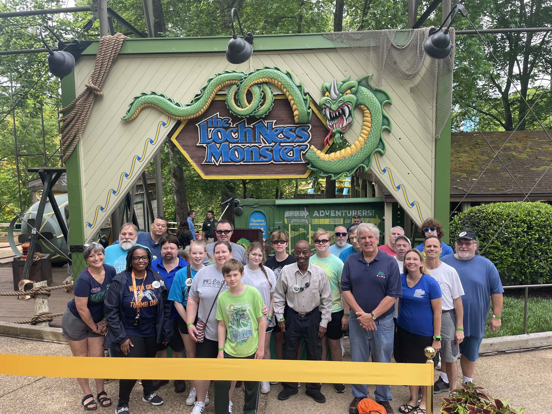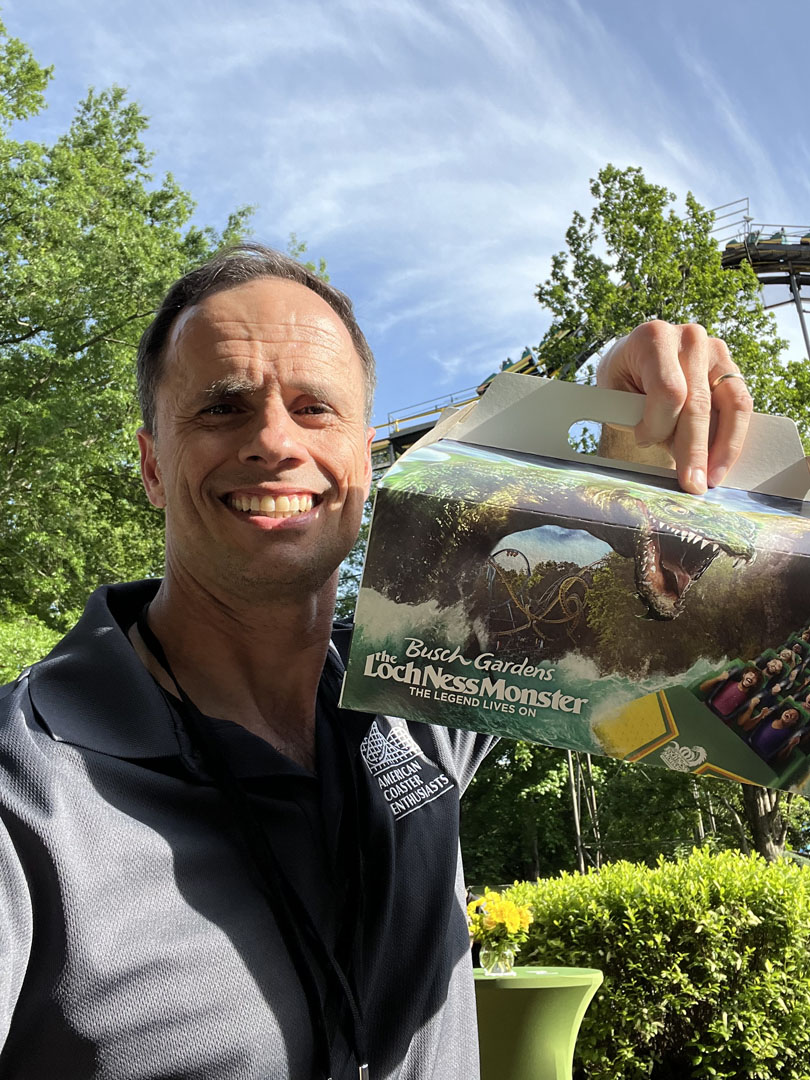 On Friday, May 10, ACE participated as a special guest for the grand reopening of Loch Ness Monster at Busch Gardens Williamsburg (Virginia). It was fitting that ACE should be present, as ACE has been there with Nessie throughout the years, beginning with Nessie being the focal point of Coaster Con I in 1978. ACE was also present for the coaster’s 10th anniversary birthday bash in 1988 and partied with it in 2018 for its 40th anniversary celebration. Busch Gardens Williamsburg reached out to ACE, and with the help of ACE President Elizabeth Ringas and some operations volunteers, the Mid-Atlantic region representatives contacted longtime members and all current and past Executive Committee members. Unfortunately, owing to the short notice, it was difficult for many to make the journey to be in attendance.